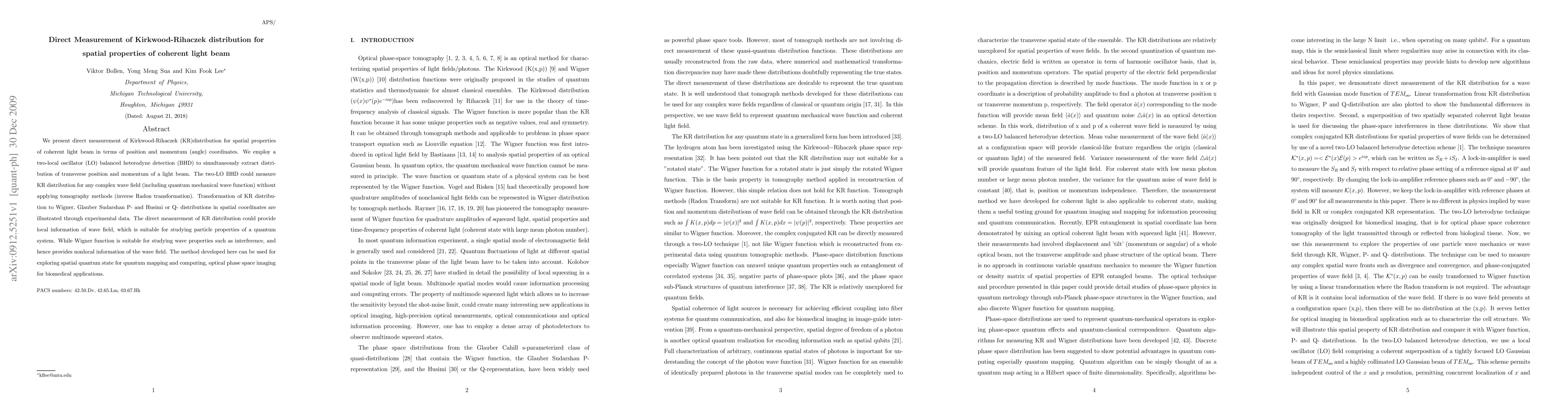 This paper presents a direct measurement technique for the Kirkwood-Rihaczek distribution of coherent light beams, utilizing two-local oscillator balanced heterodyne detection to extract spatial and momentum properties without tomography. The method enables the transformation to various quantum distributions and offers local wave field information, useful for quantum mapping and biomedical optical imaging.