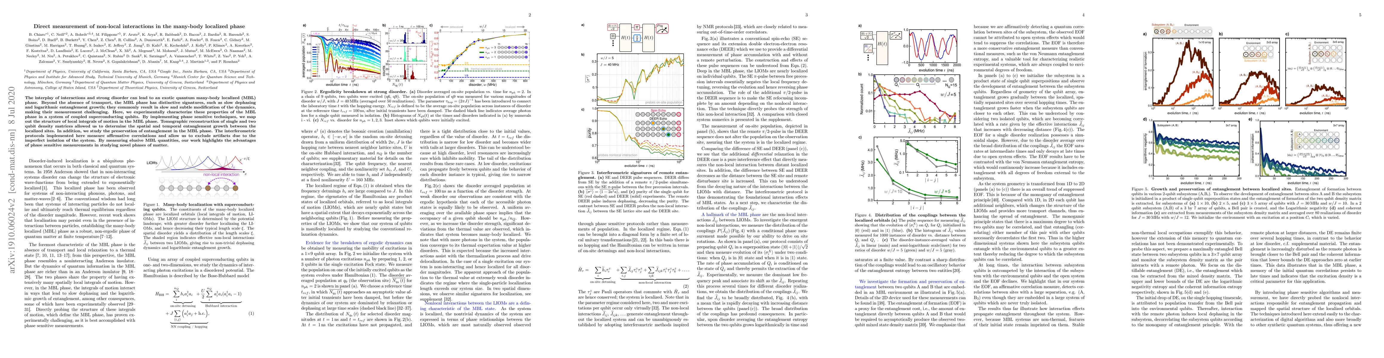 The interplay of interactions and strong disorder can lead to an exotic quantum many-body localized (MBL) phase. Beyond the absence of transport, the MBL phase has distinctive signatures, such as slow dephasing and logarithmic entanglement growth; they commonly result in slow and subtle modification of the dynamics, making their measurement challenging. Here, we experimentally characterize these properties of the MBL phase in a system of coupled superconducting qubits. By implementing phase sensitive techniques, we map out the structure of local integrals of motion in the MBL phase. Tomographic reconstruction of single and two qubit density matrices allowed us to determine the spatial and temporal entanglement growth between the localized sites. In addition, we study the preservation of entanglement in the MBL phase. The interferometric protocols implemented here measure affirmative correlations and allow us to exclude artifacts due to the imperfect isolation of the system. By measuring elusive MBL quantities, our work highlights the advantages of phase sensitive measurements in studying novel phases of matter.