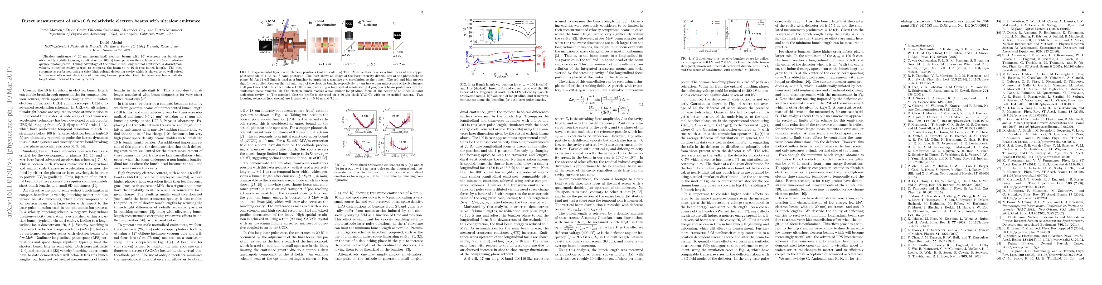 This paper reports the direct measurement of sub-10 fs relativistic electron beams with ultralow emittance achieved by focusing an ultrafast laser on a photoinjector cathode. A downstream velocity bunching cavity compresses the beam to <10 fs rms bunch length, measured using a high voltage deflecting cavity.