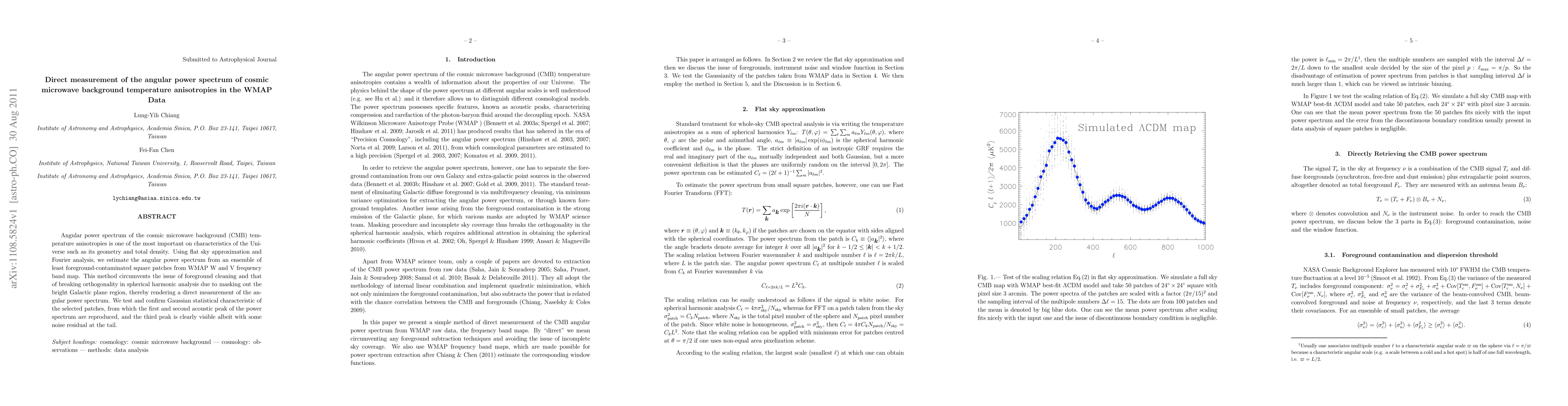 This paper presents a direct measurement of the angular power spectrum of cosmic microwave background temperature anisotropies using WMAP data, employing a flat sky approximation and Fourier analysis to avoid foreground issues and spherical harmonic analysis complications. The method confirms Gaussian statistics and reveals the first and second acoustic peaks, with a visible third peak despite some residual noise.