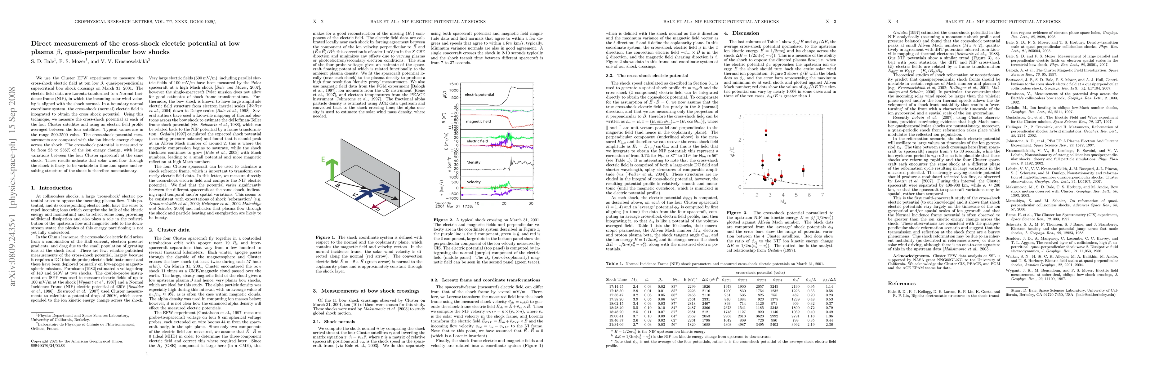 We use the Cluster EFW experiment to measure the cross-shock electric field at ten low $\beta$, quasi-perpendicular supercritical bow shock crossings on March 31, 2001. The electric field data are Lorentz-tranformed to a Normal Incidence frame (NIF), in which the incoming solar wind velocity is aligned with the shock normal. In a boundary normal coordinate system, the cross-shock (normal) electric field is integrated to obtain the cross shock potential. Using this technique, we measure the cross-shock potential at each of the four Cluster satellites and using an electric field profile averaged between the four satellites. Typical values are in the range 500-2500 volts. The cross-shock potential measurements are compared with the ion kinetic energy change across the shock. The cross-shock potential is measured to be from 23 to 236% of the ion energy change, with large variations between the four Cluster spacecraft at the same shock. These results indicate that solar wind flow through the shock is likely to be variable in time and space and resulting structure of the shock is therefore nonstationary.