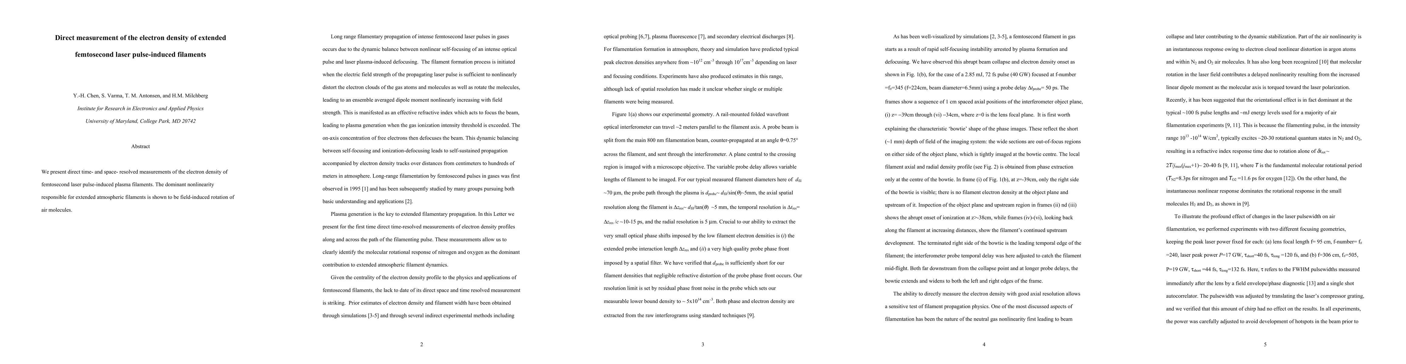 Summary: This study provides direct, time- and space-resolved measurements of electron density in femtosecond laser pulse-induced plasma filaments, revealing that field-induced rotation of air molecules is the primary nonlinearity generating extended atmospheric filaments.