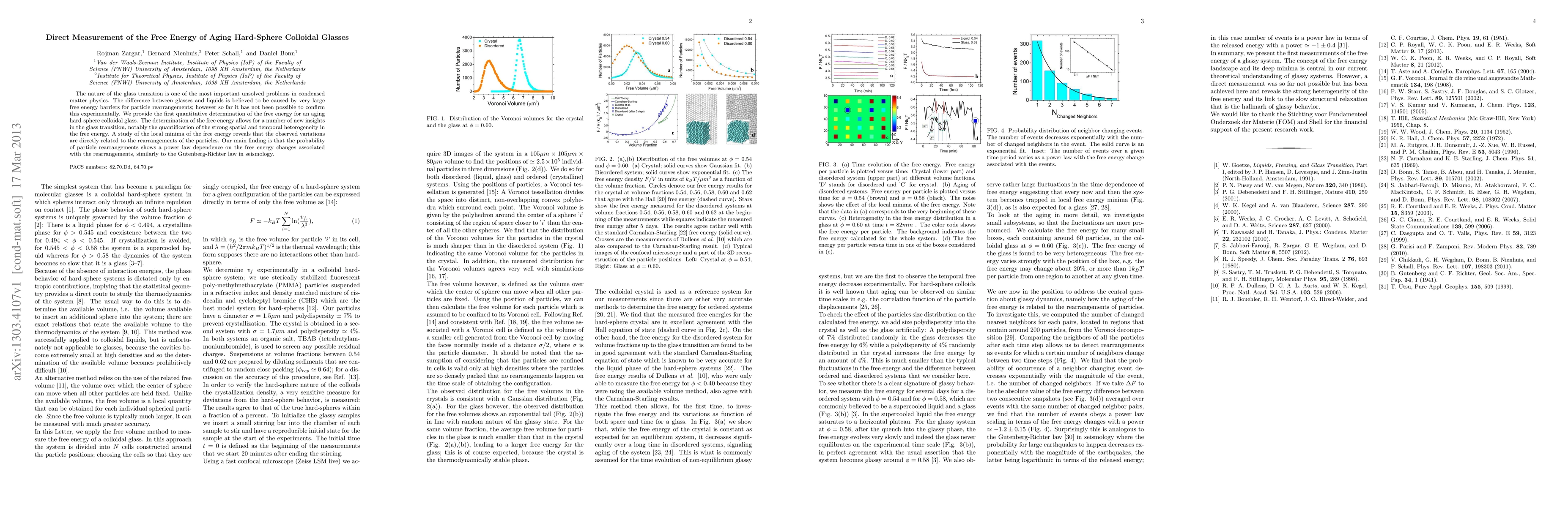 The nature of the glass transition is one of the most important unsolved problems in condensed matter physics. The difference between glasses and liquids is believed to be caused by very large free energy barriers for particle rearrangements; however so far it has not been possible to confirm this experimentally. We provide the first quantitative determination of the free energy for an aging hard-sphere colloidal glass. The determination of the free energy allows for a number of new insights in the glass transition, notably the quantification of the strong spatial and temporal heterogeneity in the free energy. A study of the local minima of the free energy reveals that the observed variations are directly related to the rearrangements of the particles. Our main finding is that the probability of particle rearrangements shows a power law dependence on the free energy changes associated with the rearrangements, similarly to the Gutenberg-Richter law in seismology.