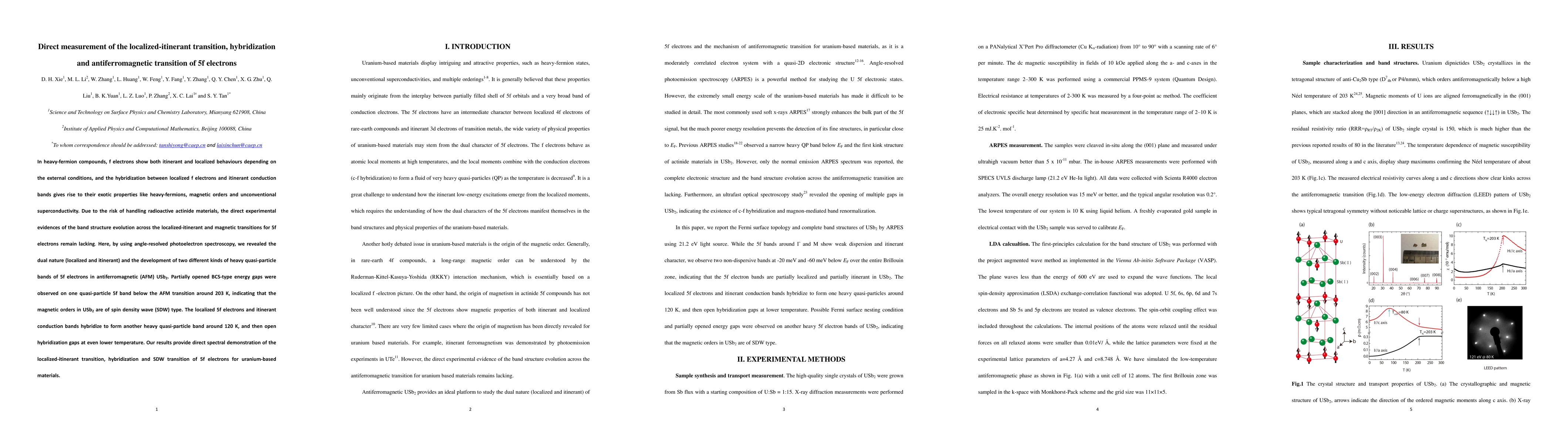 This paper uses angle-resolved photoelectron spectroscopy to directly measure the localized-itinerant transition and hybridization of 5f electrons in antiferromagnetic USb2, revealing the development of heavy quasi-particle bands and spin density wave magnetic orders. The study provides spectral evidence of the transitions and hybridization gaps in uranium-based materials.