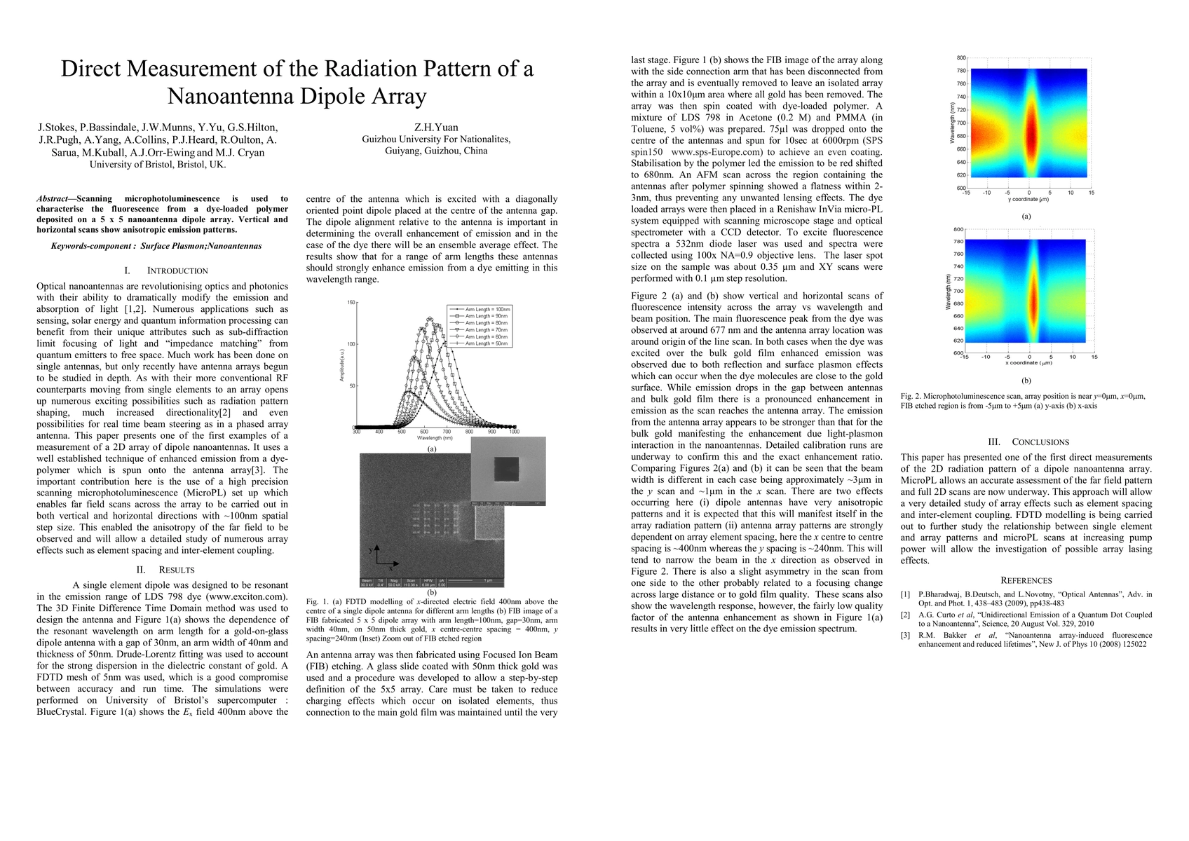 Summary: This study uses scanning microphotoluminescence to characterize the fluorescence from a dye-loaded polymer on a 5 x 5 nanoantenna dipole array, revealing anisotropic emission patterns in both vertical and horizontal scans.