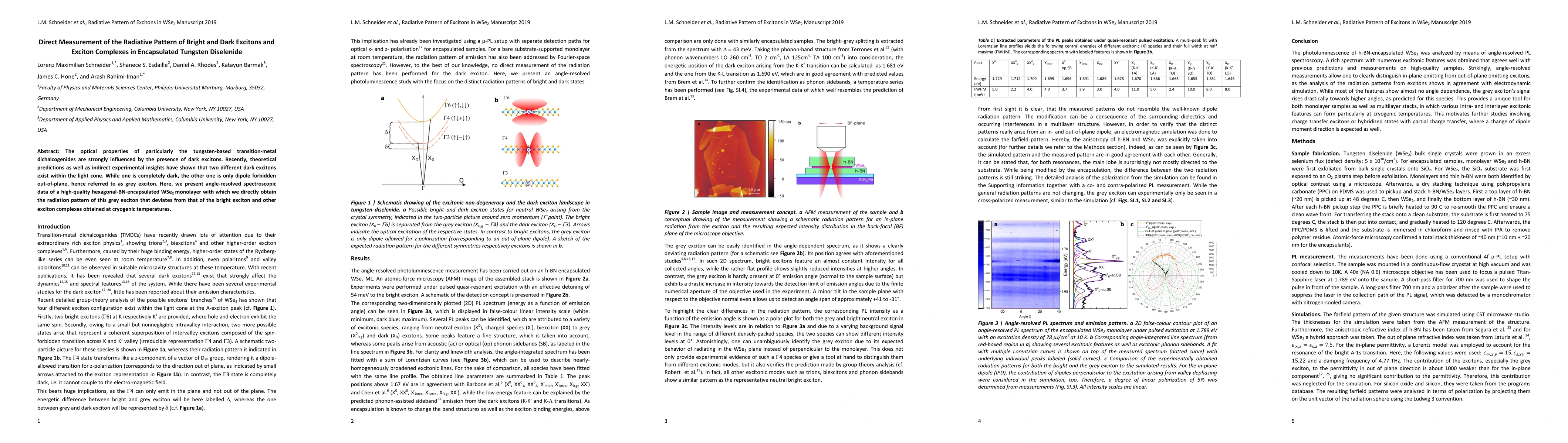 This paper reports on the direct measurement of the radiative pattern of bright and dark excitons, including a grey exciton, in encapsulated tungsten diselenide (WSe2) using angle-resolved spectroscopy. The study reveals distinct radiation patterns for the grey exciton compared to bright excitons and other complexes, providing new insights into the optical properties of tungsten-based transition-metal dichalcogenides.