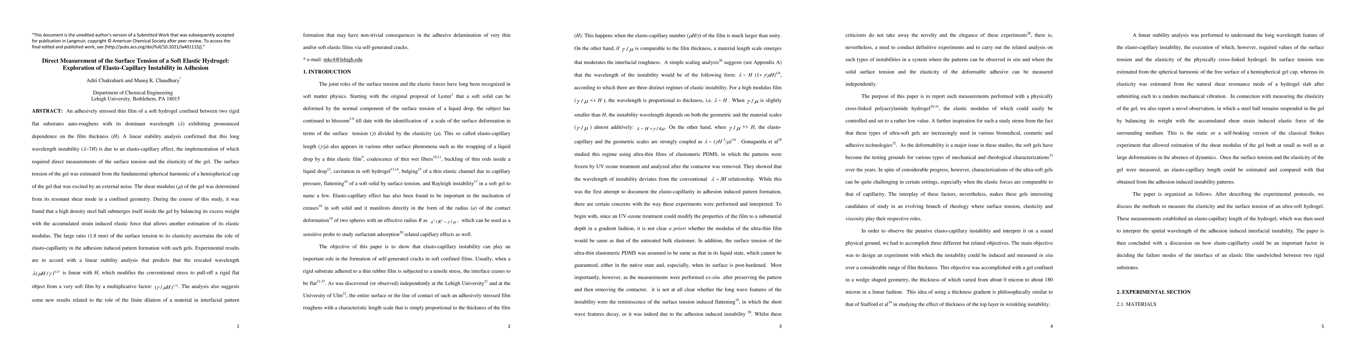 This research investigates the surface tension and elasticity of soft elastic hydrogels, revealing elasto-capillary instability in adhesion. The study finds that the surface tension significantly influences pattern formation, with experimental results aligning with linear stability analysis predictions.