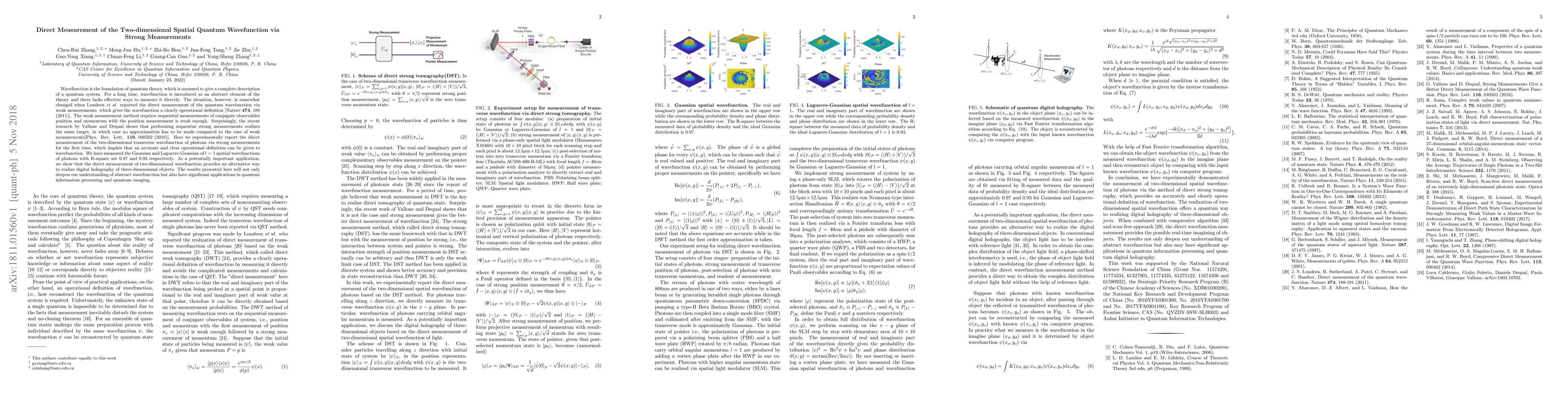 This paper reports the first direct measurement of the two-dimensional spatial quantum wavefunction of photons using strong measurements, achieving high accuracy with R-square values of 0.97 and 0.93 for Gaussian and Laguerre-Gaussian modes. This method provides an alternative approach to digital holography for three-dimensional object reconstruction, enhancing both our understanding of quantum wavefunction and its applications in quantum information and imaging.