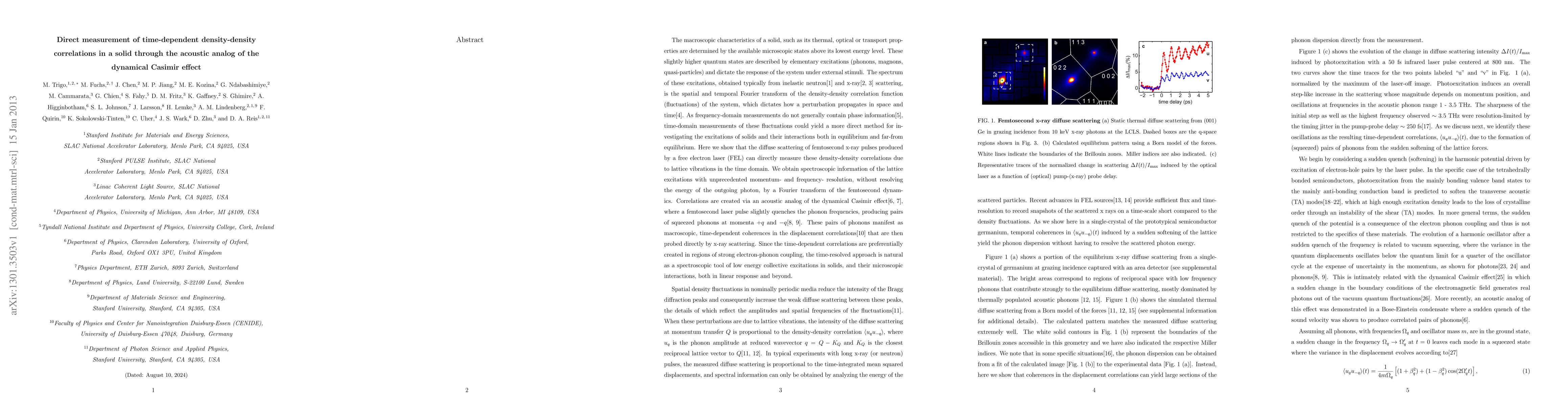 The macroscopic characteristics of a solid, such as its thermal, optical or transport properties are determined by the available microscopic states above its lowest energy level. These slightly higher quantum states are described by elementary excitations and dictate the response of the system under external stimuli. The spectrum of these excitations, obtained typically from inelastic neutron and x-ray scattering, is the spatial and temporal Fourier transform of the density-density correlation function of the system, which dictates how a perturbation propagates in space and time. As frequency-domain measurements do not generally contain phase information, time-domain measurements of these fluctuations could yield a more direct method for investigating the excitations of solids and their interactions both in equilibrium and far-from equilibrium. Here we show that the diffuse scattering of femtosecond x-ray pulses produced by a free electron laser (FEL) can directly measure these density-density correlations due to lattice vibrations in the time domain. We obtain spectroscopic information of the lattice excitations with unprecedented momentum- and frequency- resolution, without resolving the energy of the outgoing photon. Correlations are created via an acoustic analog of the dynamical Casimir effect, where a femtosecond laser pulse slightly quenches the phonon frequencies, producing pairs of squeezed phonons at momenta +q and -q. These pairs of phonons manifest as macroscopic, time-dependent coherences in the displacement correlations that are then probed directly by x-ray scattering. Since the time-dependent correlations are preferentially created in regions of strong electron-phonon coupling, the time-resolved approach is natural as a spectroscopic tool of low energy collective excitations in solids, and their microscopic interactions, both in linear response and beyond.