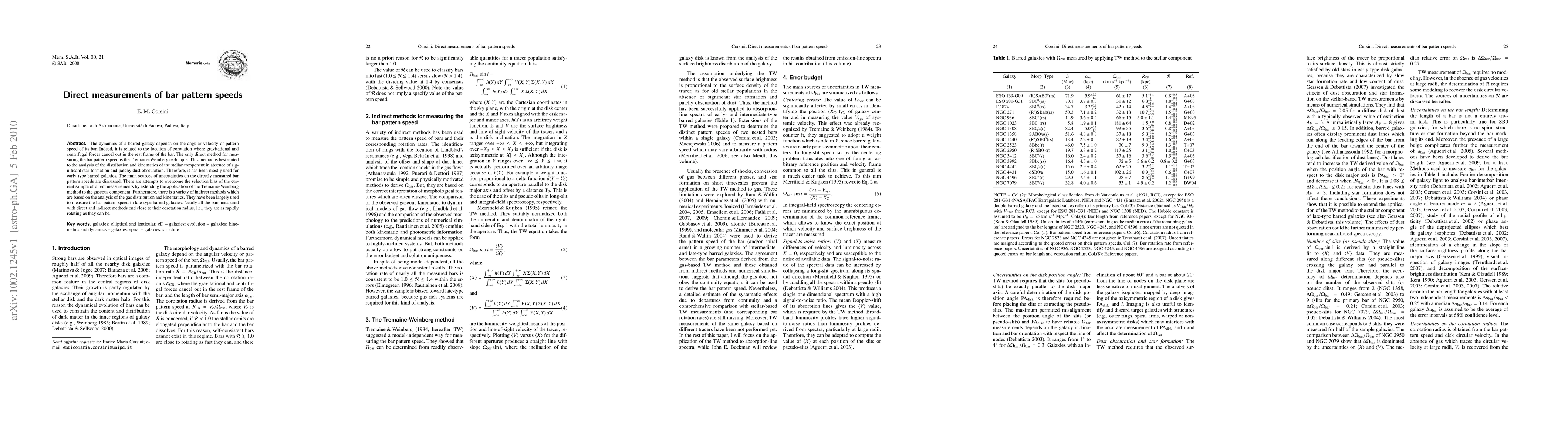 This paper discusses direct measurements of bar pattern speeds in galaxies, focusing on the Tremaine-Weinberg technique, which is most applicable to early-type barred galaxies. It also explores uncertainties in these measurements and attempts to extend the method to gaseous components, while noting the use of indirect methods for late-type barred galaxies.
