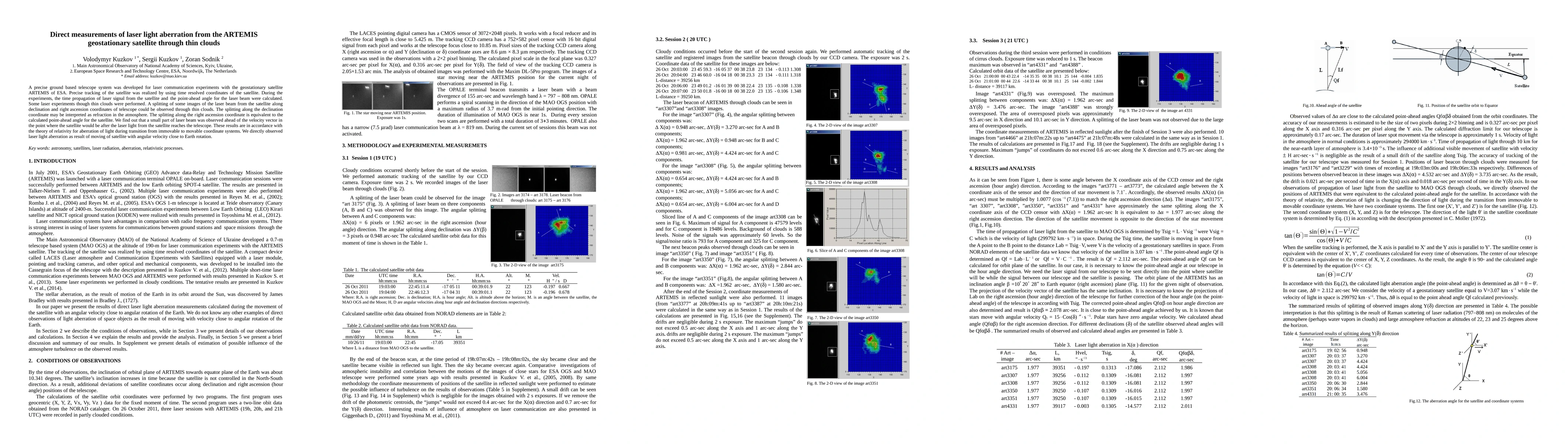 This study developed a ground-based telescope system to track the ARTEMIS geostationary satellite, observing laser light aberration through thin clouds. The results confirmed the theory of relativity by directly measuring the splitting of laser beams due to atmospheric refraction and the point-ahead angle, demonstrating light aberration from the satellite's motion.