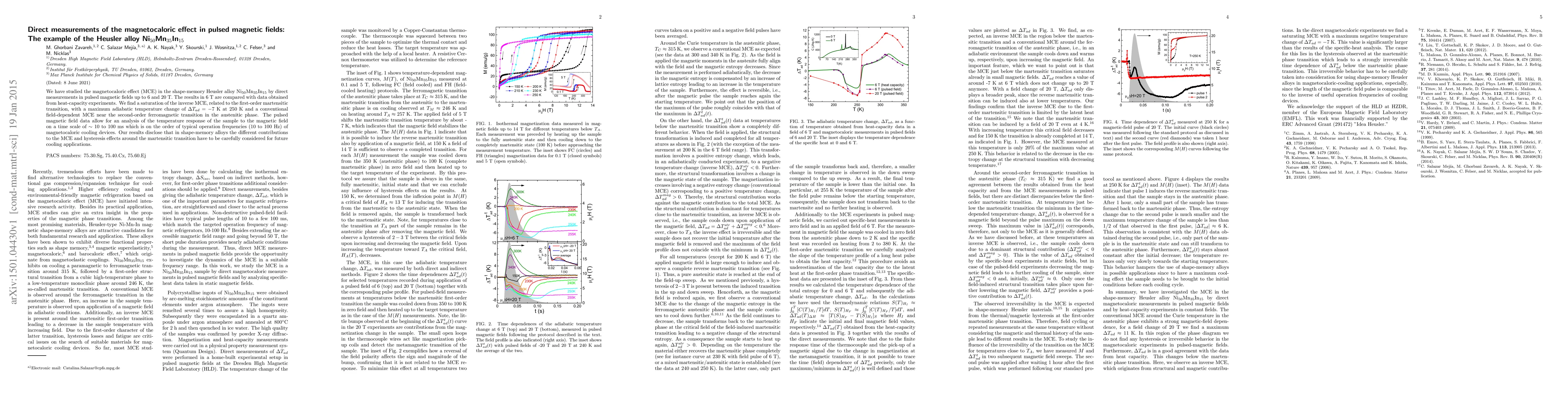This study investigates the magnetocaloric effect in the Heusler alloy Ni$_{50}$Mn$_{35}$In$_{15}$ using pulsed magnetic fields, revealing a saturation of the inverse MCE near the martensitic transition and a conventional MCE near the ferromagnetic transition. The findings highlight the importance of considering different MCE contributions for magnetocaloric cooling applications.