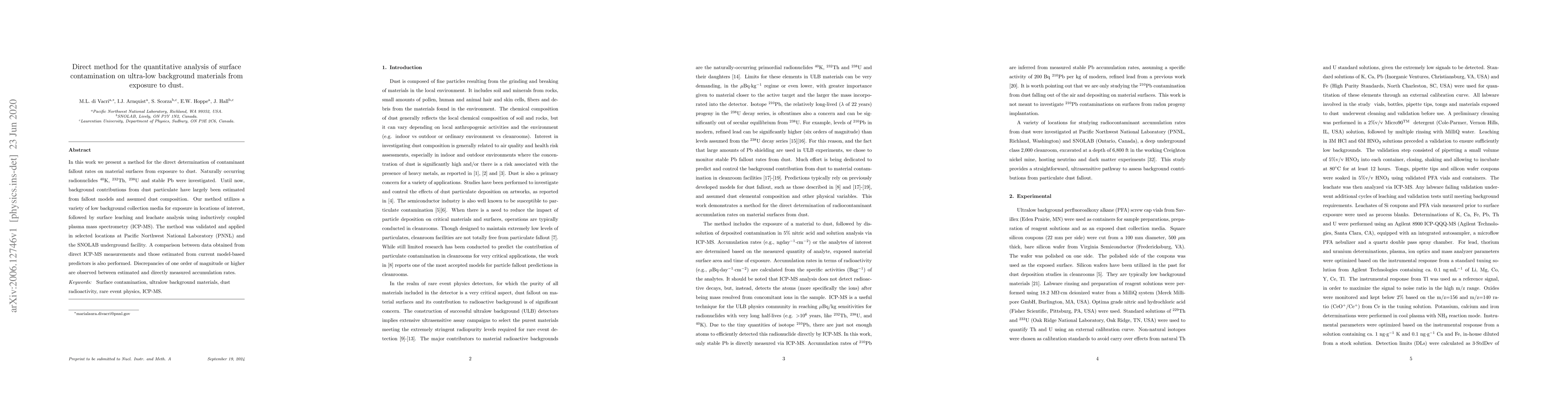 In this work we present a method for the direct determination of contaminant fallout rates on material surfaces from exposure to dust. Naturally occurring radionuclides K-40, Th-232, U-238 and stable Pb were investigated. Until now, background contributions from dust particulate have largely been estimated from fallout models and assumed dust composition. Our method utilizes a variety of low background collection media for exposure in locations of interest, followed by surface leaching and leachate analysis using inductively coupled plasma mass spectrometry (ICP-MS). The method was validated and applied in selected locations at Pacific Northwest National Laboratory (PNNL) and the SNOLAB underground facility.
