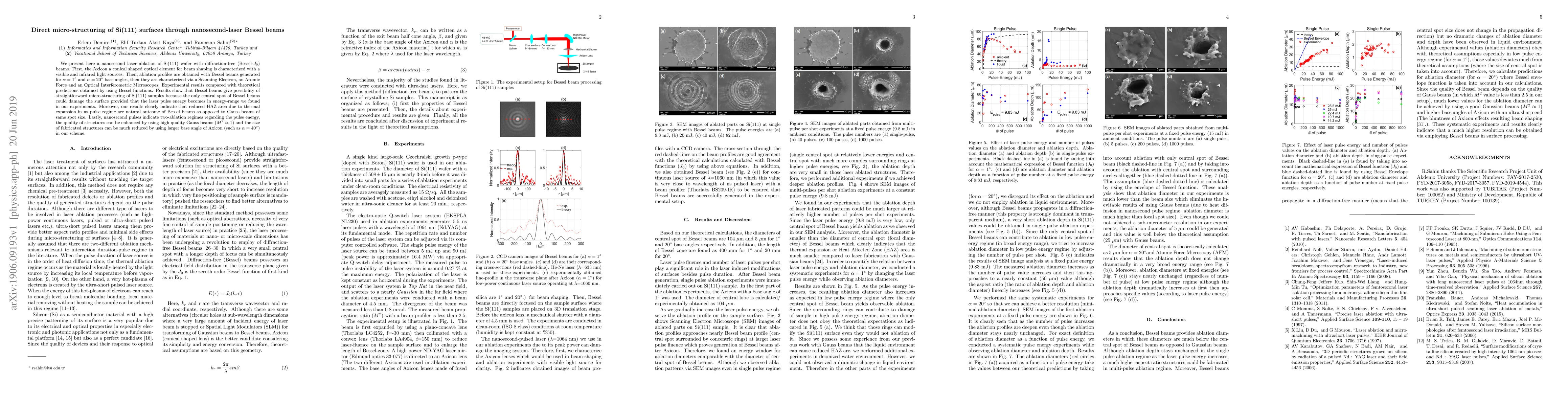 The paper presents a method for direct micro-structuring of Si(111) surfaces using nanosecond-laser Bessel beams, demonstrating reduced HAZ areas and finer structure sizes compared to Gaussian beams.