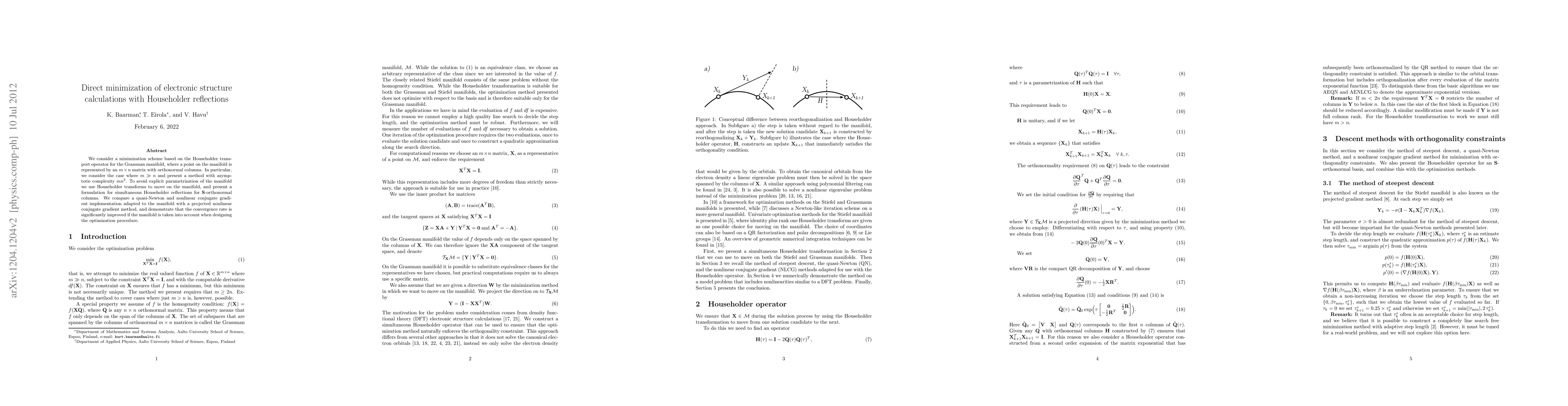 This paper proposes a minimization scheme using Householder reflections for electronic structure calculations on the Grassman manifold, achieving an asymptotic complexity of mn^2 for m >> n. It avoids explicit parametrization by employing simultaneous Householder transforms, and demonstrates improved convergence rates compared to traditional methods when optimizing on the manifold.