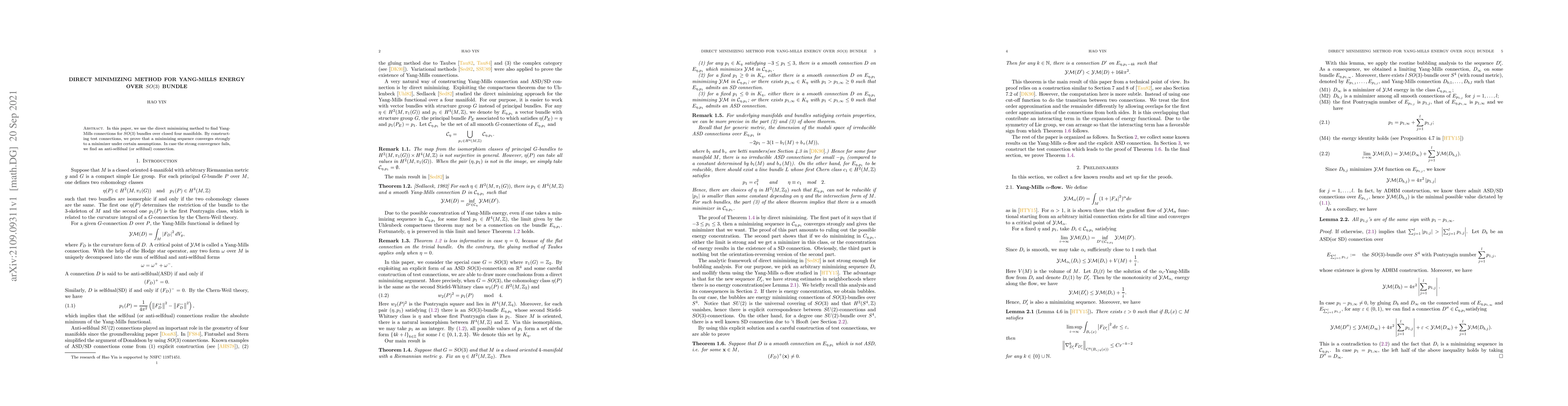 In this paper, we use the direct minimizing method to find Yang-Mills connections for $SO(3)$ bundles over closed four manifolds. By constructing test connections, we prove that a minimizing sequence converges strongly to a minimizer under certain assumptions. In case the strong convergence fails, we find an anti-selfdual (or selfdual) connection.