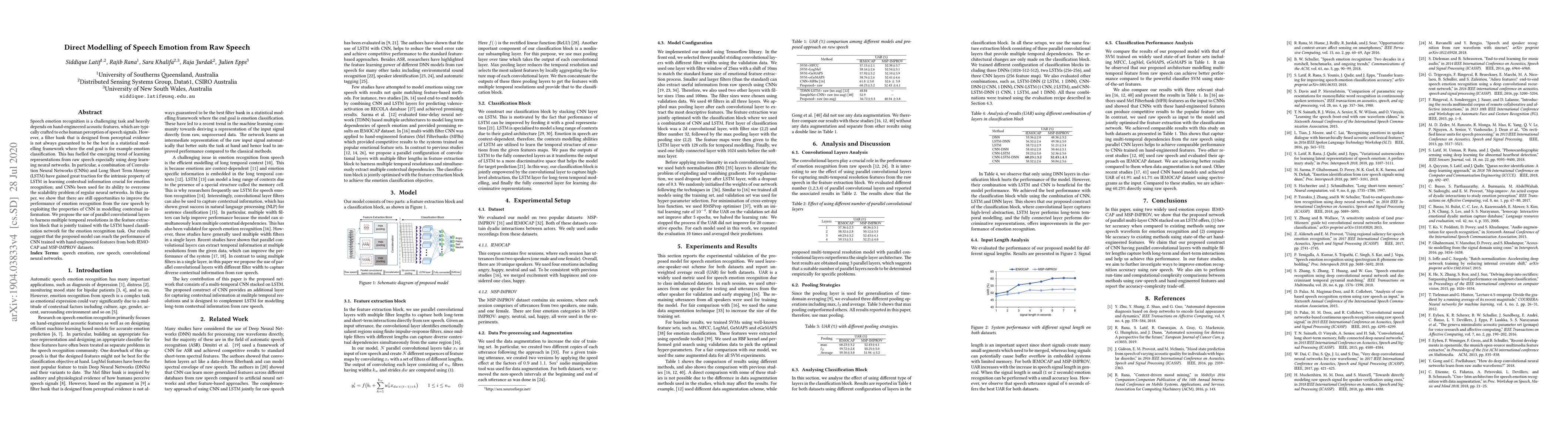 This research explores the use of deep learning techniques, specifically Convolutional Neural Networks (CNNs) and Long Short Term Memory (LSTM) networks, to directly model speech emotion from raw audio data. The study proposes a model that employs parallel convolutional layers to capture multiple temporal resolutions, which is trained jointly with an LSTM network for emotion classification, achieving competitive results on IEMOCAP and MSP-IMPROV datasets.
