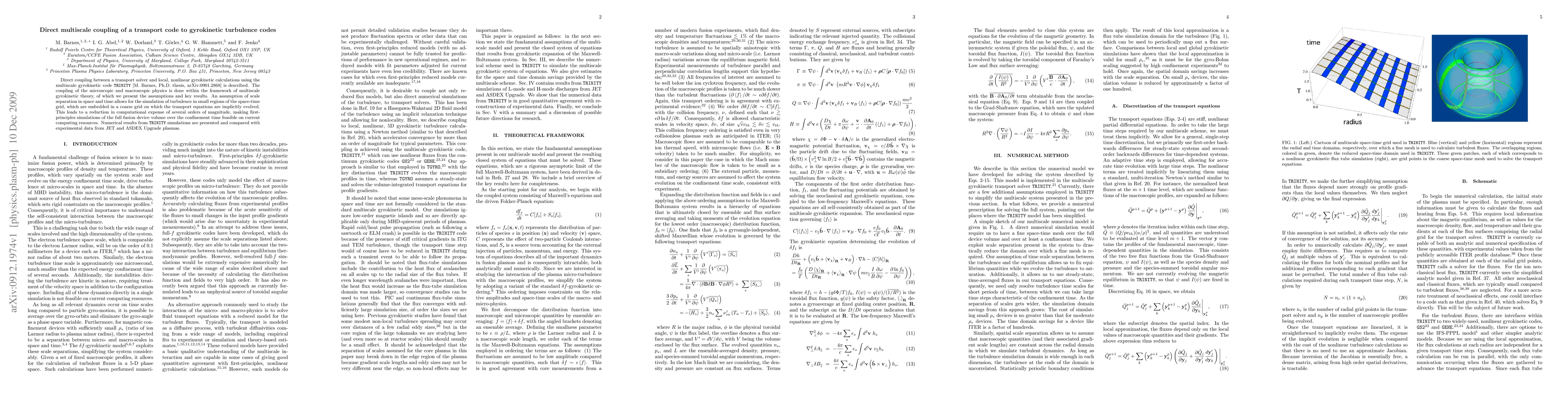 Direct coupling between a transport solver and local, nonlinear gyrokinetic calculations using the multiscale gyrokinetic code TRINITY [M. Barnes, Ph.D. thesis, arxiv:0901.2868] is described. The coupling of the microscopic and macroscopic physics is done within the framework of multiscale gyrokinetic theory, of which we present the assumptions and key results. An assumption of scale separation in space and time allows for the simulation of turbulence in small regions of the space-time grid, which are embedded in a coarse grid on which the transport equations are implicitly evolved. This leads to a reduction in computational expense of several orders of magnitude, making first-principles simulations of the full fusion device volume over the confinement time feasible on current computing resources. Numerical results from TRINITY simulations are presented and compared with experimental data from JET and ASDEX Upgrade plasmas.