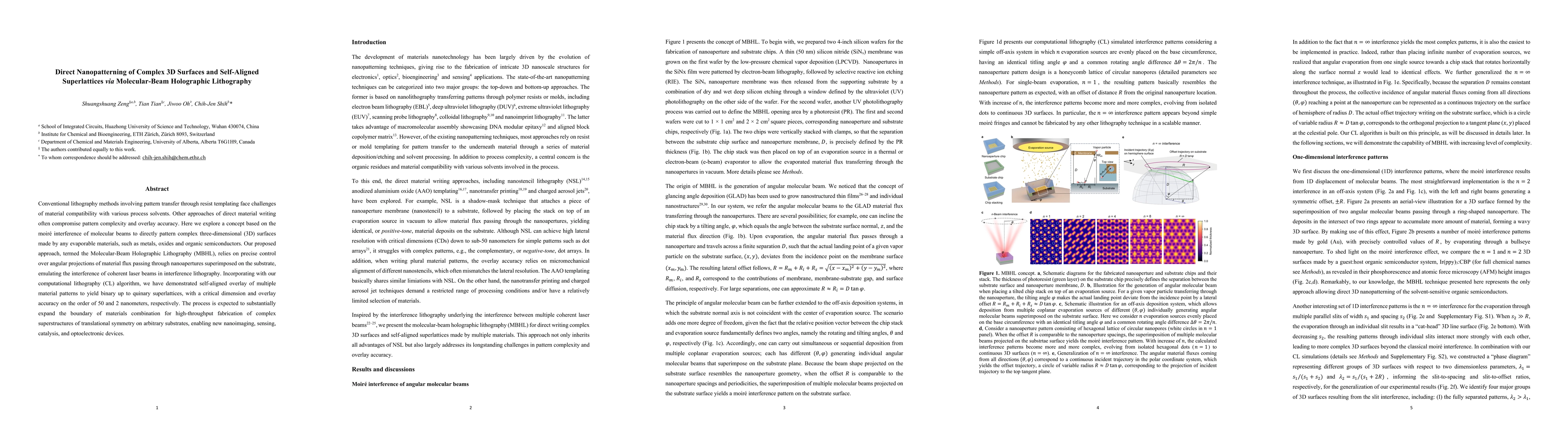 This paper introduces Molecular-Beam Holographic Lithography (MBHL) for direct nanopatterning of complex 3D surfaces, achieving high pattern complexity and overlay accuracy using moiré interference of molecular beams. The method enables self-aligned fabrication of binary to quinary superlattices with nanometer-scale precision, broadening material compatibility for advanced nanodevices.