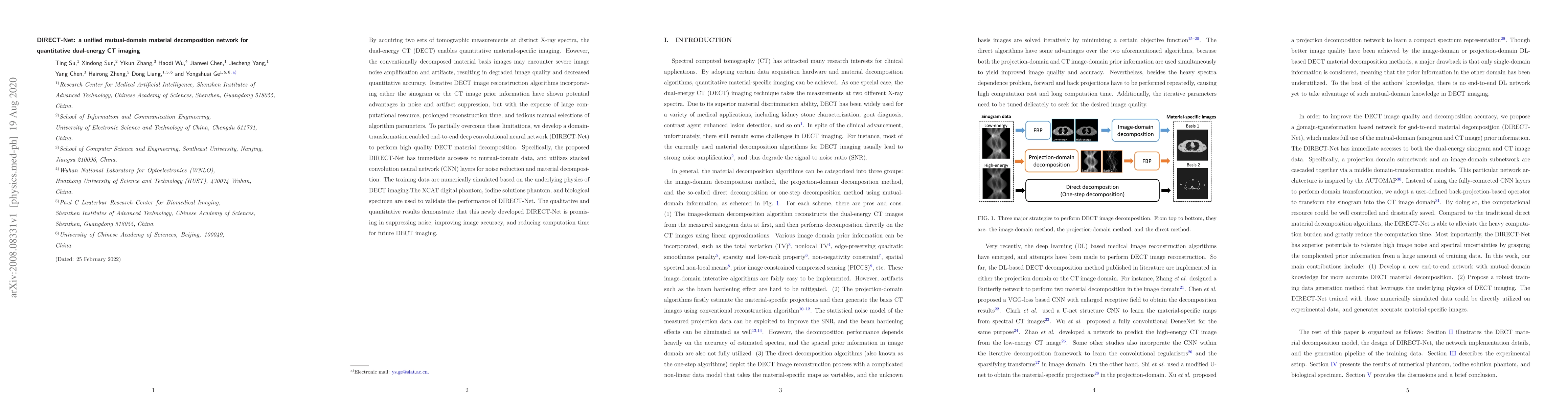 DIRECT-Net is a deep convolutional neural network designed for high-quality material decomposition in dual-energy CT imaging, aiming to reduce noise and artifacts while minimizing computational costs and reconstruction time. The network's performance is validated through simulated and physical phantom data, showing promising results in noise suppression and improved quantitative accuracy.