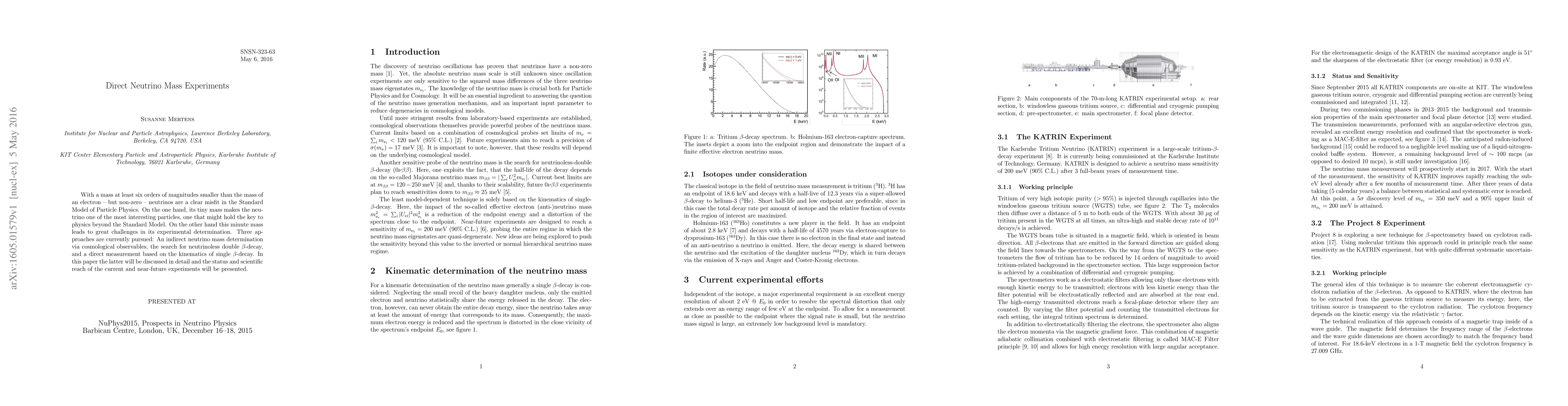 This paper explores direct neutrino mass experiments, focusing on the kinematic analysis of single $\beta$-decay. It discusses the challenges and current status of these experiments, aiming to determine the minute yet non-zero mass of neutrinos, which could provide insights into physics beyond the Standard Model.