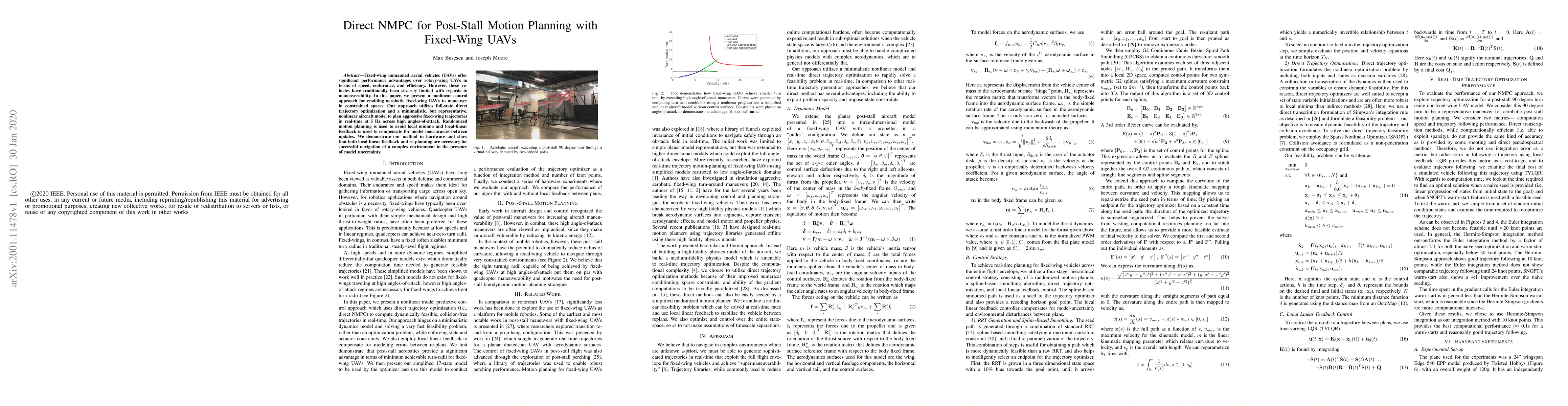 Fixed-wing unmanned aerial vehicles (UAVs) offer significant performance advantages over rotary-wing UAVs in terms of speed, endurance, and efficiency. However, these vehicles have traditionally been severely limited with regards to maneuverability. In this paper, we present a nonlinear control approach for enabling aerobatic fixed-wing UAVs to maneuver in constrained spaces. Our approach utilizes full-state direct trajectory optimization and a minimalistic, but representative, nonlinear aircraft model to plan aggressive fixed-wing trajectories in real-time at 5 Hz across high angles-of-attack. Randomized motion planning is used to avoid local minima and local-linear feedback is used to compensate for model inaccuracies between updates. We demonstrate our method in hardware and show that both local-linear feedback and re-planning are necessary for successful navigation of a complex environment in the presence of model uncertainty.