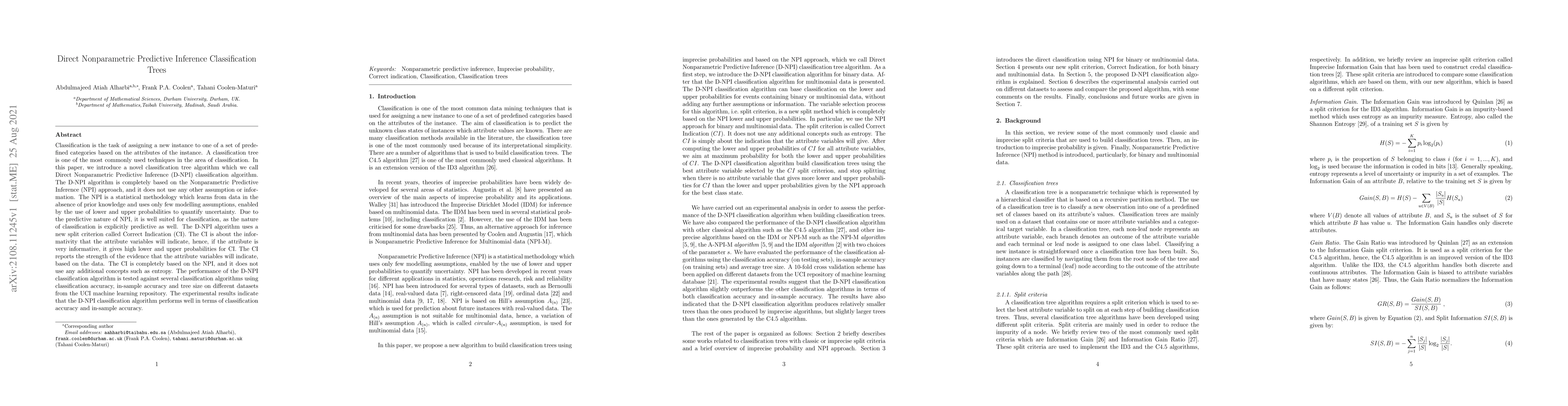 This paper introduces the Direct Nonparametric Predictive Inference (D-NPI) classification algorithm, which employs the Nonparametric Predictive Inference (NPI) approach without assumptions. The new Correct Indication (CI) split criterion assesses attribute informativity based on NPI, and experimental results show the D-NPI algorithm performs well in classification accuracy and in-sample accuracy.