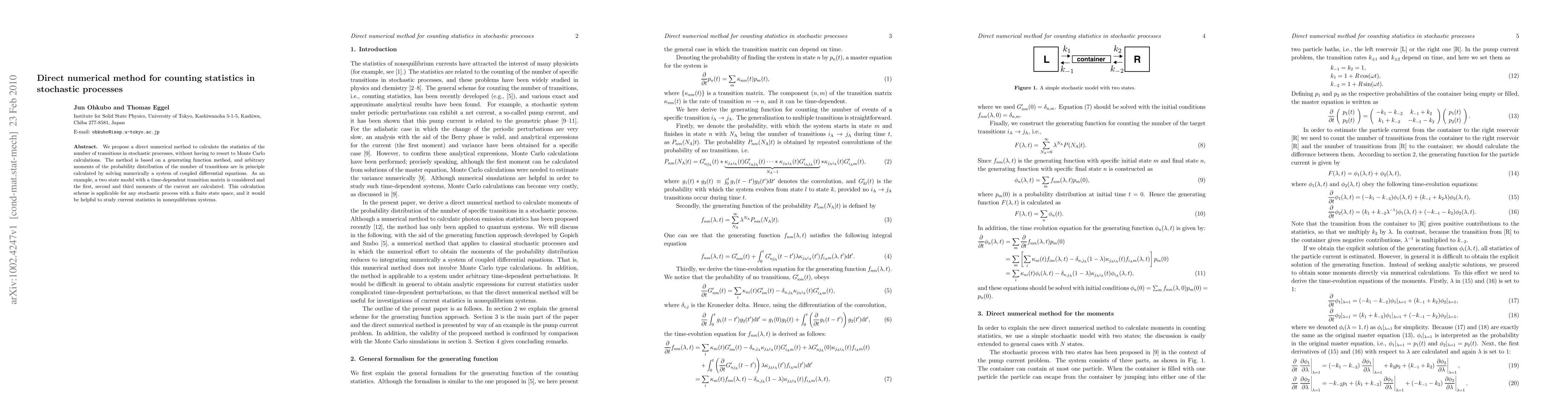 This paper introduces a direct numerical method for calculating transition statistics in stochastic processes using a generating function approach, avoiding Monte Carlo simulations. The method solves coupled differential equations to determine arbitrary moments of the transition probability distribution, demonstrated through a two-state model with time-dependent transitions.