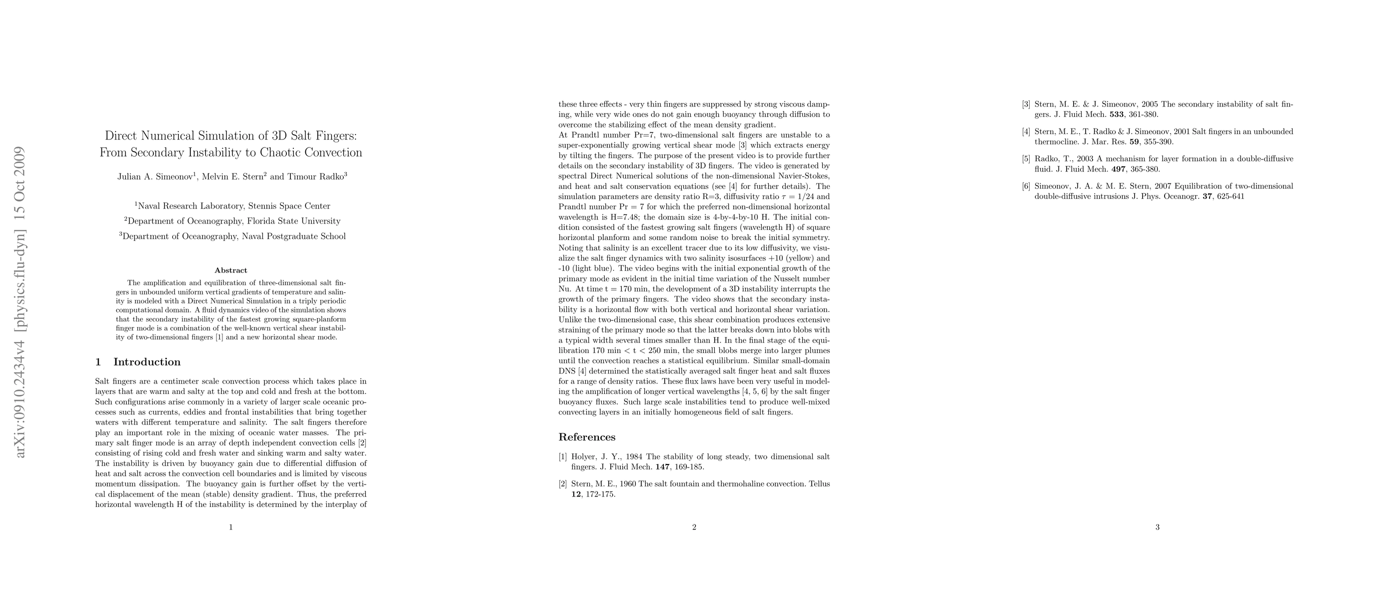 The amplification and equilibration of three-dimensional salt fingers in unbounded uniform vertical gradients of temperature and salinity is modeled with a Direct Numerical Simulation in a triply periodic computational domain. A fluid dynamics video of the simulation shows that the secondary instability of the fastest growing square-planform finger mode is a combination of the well-known vertical shear instability of two-dimensional fingers [Holyer, 1984] and a new horizontal shear mode.