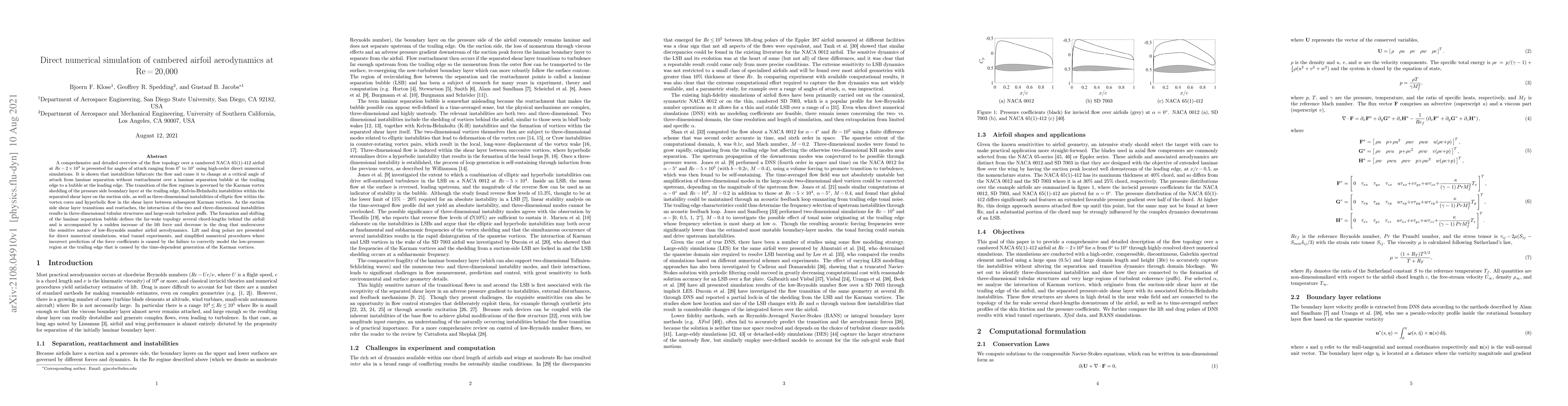 This paper presents high-order direct numerical simulations of a cambered NACA 65(1)-412 airfoil at Re = 20,000, revealing complex flow instabilities and transitions from laminar to turbulent regimes, significantly affecting lift and drag. The study highlights the critical role of Karman vortex shedding, Kelvin-Helmholtz instabilities, and three-dimensional flow structures in the aerodynamic behavior.