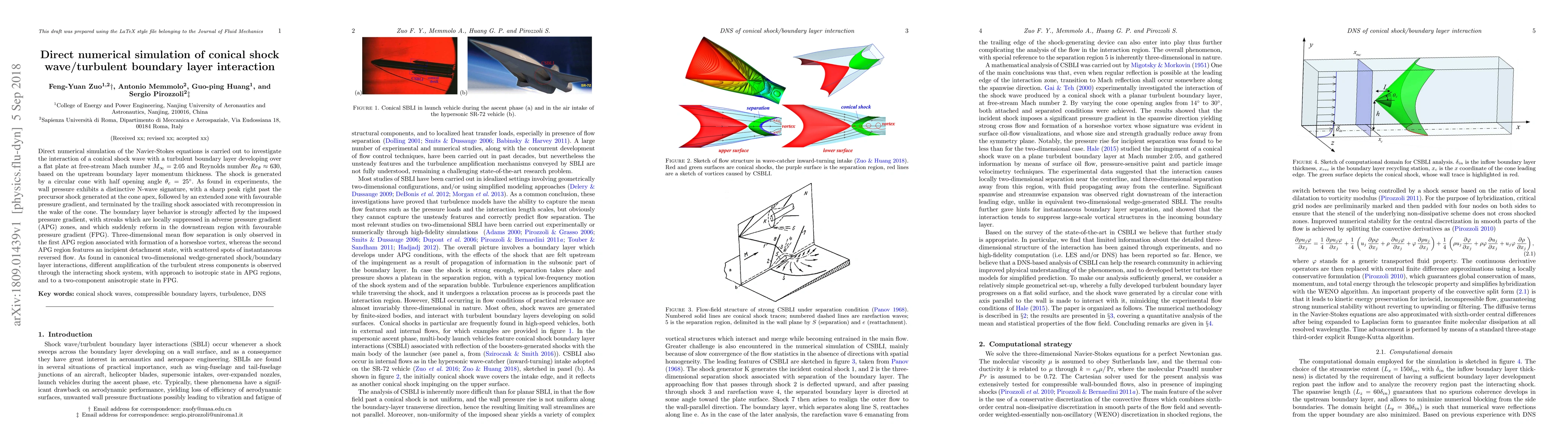 This paper uses direct numerical simulation to study the interaction between a conical shock wave and a turbulent boundary layer at high Mach number, revealing an N-wave pressure signature and significant changes in boundary layer behavior, including mean flow separation and variations in turbulent stress components.