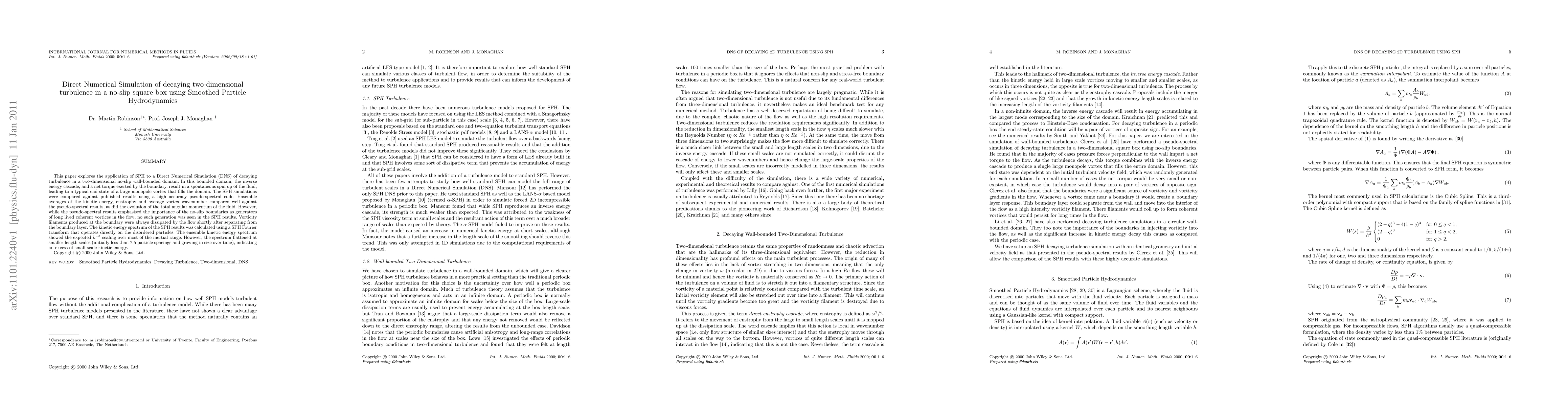 This paper explores the application of SPH to a Direct Numerical Simulation (DNS) of decaying turbulence in a two-dimensional no-slip wall-bounded domain. In this bounded domain, the inverse energy cascade, and a net torque exerted by the boundary, result in a spontaneous spin up of the fluid, leading to a typical end state of a large monopole vortex that fills the domain. The SPH simulations were compared against published results using a high accuracy pseudo-spectral code. Ensemble averages of the kinetic energy, enstrophy and average vortex wavenumber compared well against the pseudo-spectral results, as did the evolution of the total angular momentum of the fluid. However, while the pseudo-spectral results emphasised the importance of the no-slip boundaries as generators of long lived coherent vortices in the flow, no such generation was seen in the SPH results. Vorticity filaments produced at the boundary were always dissipated by the flow shortly after separating from the boundary layer. The kinetic energy spectrum of the SPH results was calculated using a SPH Fourier transform that operates directly on the disordered particles. The ensemble kinetic energy spectrum showed the expected k-3 scaling over most of the inertial range. However, the spectrum flattened at smaller length scales (initially less than 7.5 particle spacings and growing in size over time), indicating an excess of small-scale kinetic energy.