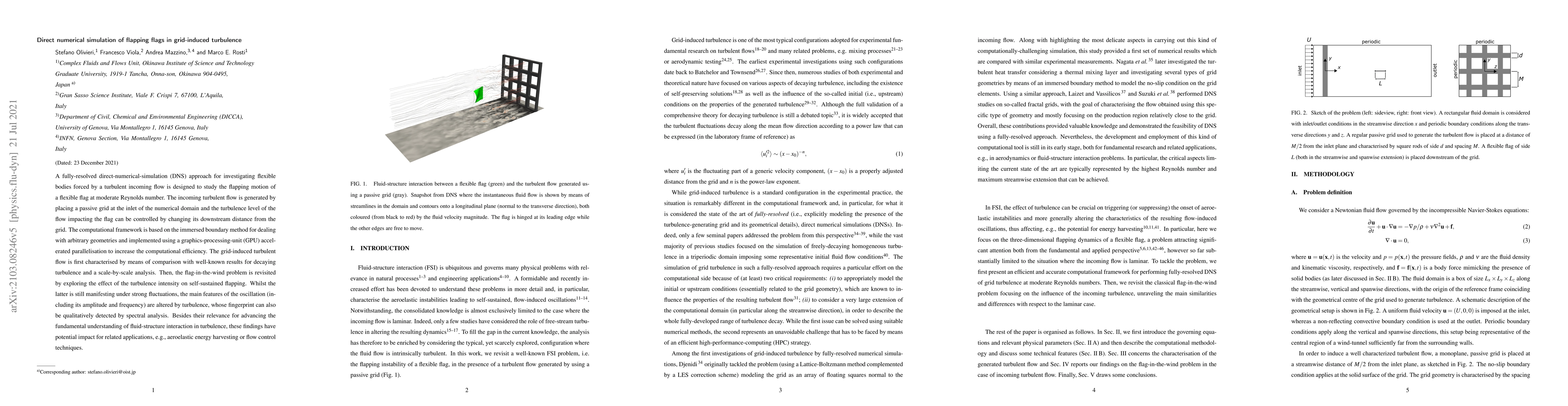 This paper employs direct numerical simulation to study the flapping motion of a flexible flag in grid-induced turbulence, revealing how turbulence intensity alters the flag's oscillation characteristics. The findings enhance the fundamental understanding of fluid-structure interaction and have implications for applications like aeroelastic energy harvesting and flow control.