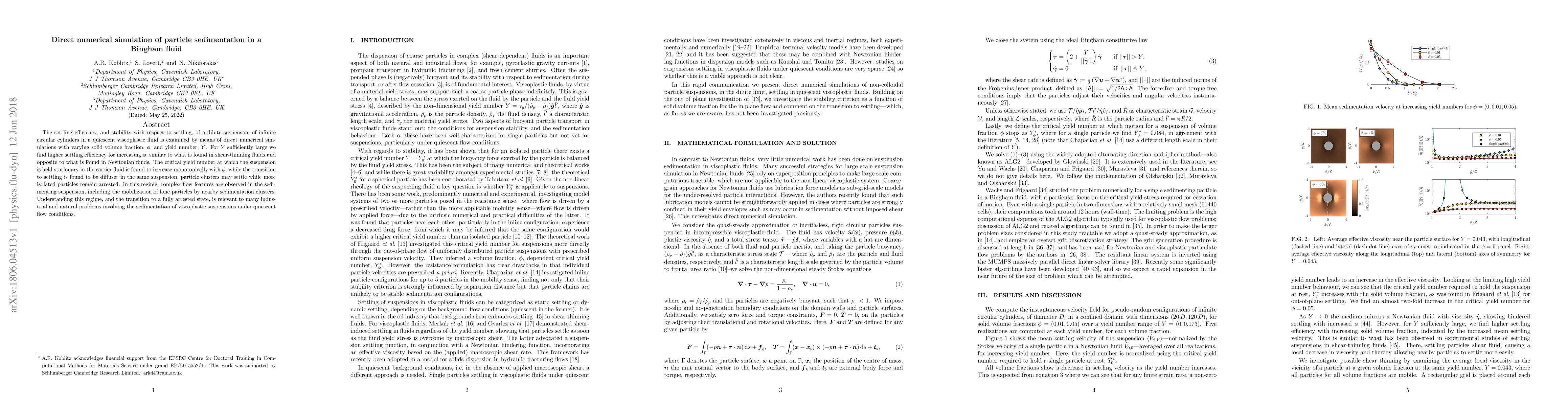 The settling efficiency, and stability with respect to settling, of a dilute suspension of infinite circular cylinders in a quiescent viscoplastic fluid is examined by means of direct numerical simulations with varying solid volume fraction, $\phi$, and yield number, $Y$ . For $Y$ sufficiently large we find higher settling efficiency for increasing $\phi$, similar to what is found in shear-thinning fluids and opposite to what is found in Newtonian fluids. The critical yield number at which the suspension is held stationary in the carrier fluid is found to increase monotonically with $\phi$, while the transition to settling is found to be diffuse: in the same suspension, particle clusters may settle while more isolated particles remain arrested. In this regime, complex flow features are observed in the sedimenting suspension, including the mobilization of lone particles by nearby sedimentation clusters. Understanding this regime, and the transition to a fully arrested state, is relevant to many industrial and natural problems involving the sedimentation of viscoplastic suspensions under quiescent flow conditions.