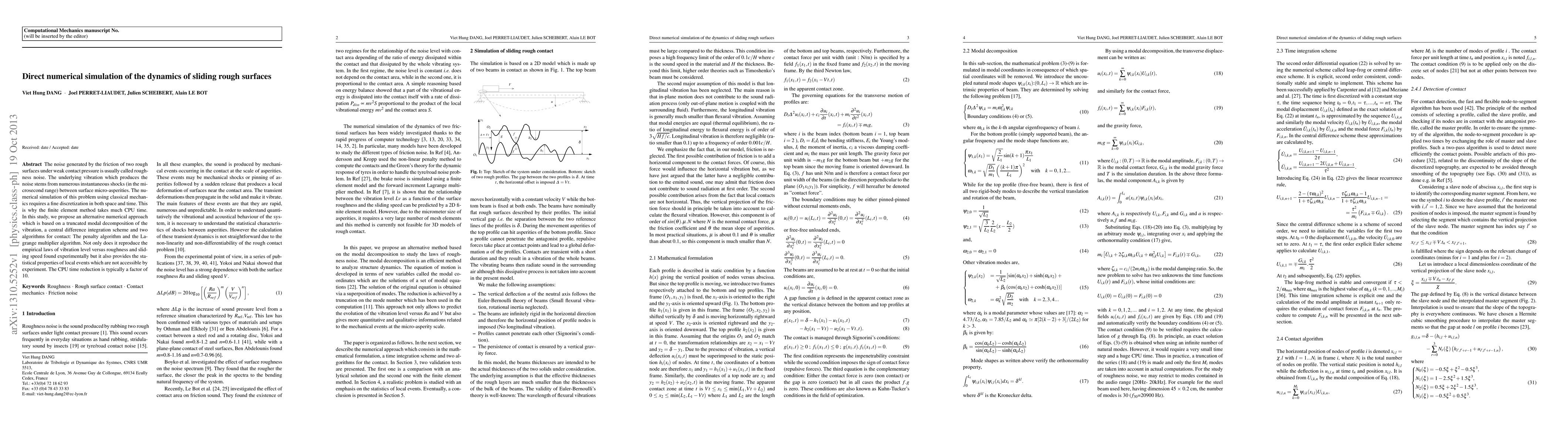 The noise generated by the friction of two rough surfaces under weak contact pressure is usually called roughness noise. The underlying vibration which produces the noise stems from numerous instantaneous shocks (in the microsecond range) between surface micro-asperities. The numerical simulation of this problem using classical mechanics requires a fine discretization in both space and time. This is why the finite element method takes much CPU time. In this study, we propose an alternative numerical approach which is based on a truncated modal decomposition of the vibration, a central difference integration scheme and two algorithms for contact: The penalty algorithm and the Lagrange multiplier algorithm. Not only does it reproduce the empirical laws of vibration level versus roughness and sliding speed found experimentally but it also provides the statistical properties of local events which are not accessible by experiment. The CPU time reduction is typically a factor of 10.