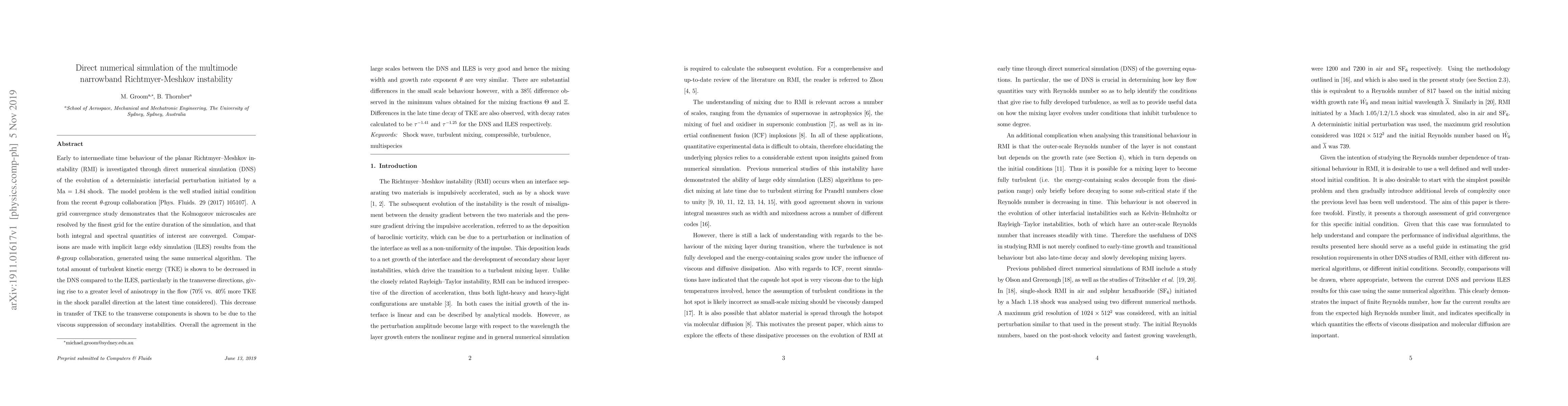 This paper investigates the early to intermediate time behavior of planar Richtmyer-Meshkov instability via direct numerical simulation, showing decreased turbulent kinetic energy in DNS compared to implicit large eddy simulations, particularly in transverse directions, due to viscous suppression of secondary instabilities. The large-scale behavior agrees well, but small-scale differences and late-time decay rates differ significantly.