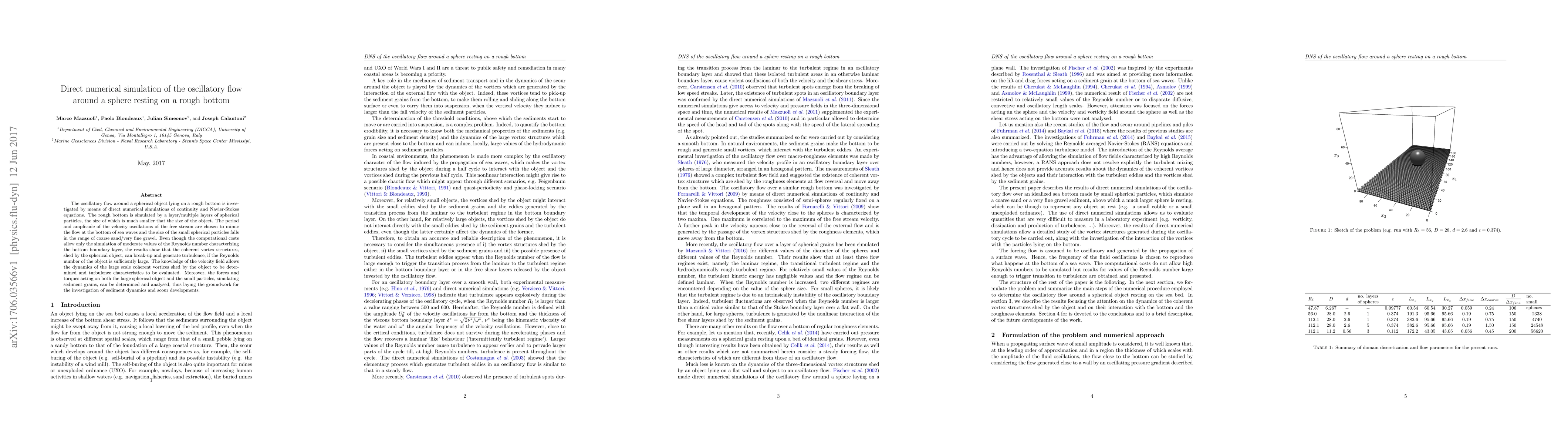 The oscillatory flow around a spherical object lying on a rough bottom is investigated by means of direct numerical simulations of continuity and Navier-Stokes equations. The rough bottom is simulated by a layer/multiple layers of spherical particles, the size of which is much smaller that the size of the object. The period and amplitude of the velocity oscillations of the free stream are chosen to mimic the flow at the bottom of sea waves and the size of the small spherical particles falls in the range of coarse sand/very fine gravel. Even though the computational costs allow only the simulation of moderate values of the Reynolds number characterizing the bottom boundary layer, the results show that the coherent vortex structures, shed by the spherical object, can break-up and generate turbulence, if the Reynolds number of the object is sufficiently large. The knowledge of the velocity field allows the dynamics of the large scale coherent vortices shed by the object to be determined and turbulence characteristics to be evaluated. Moreover, the forces and torques acting on both the large spherical object and the small particles, simulating sediment grains, can be determined and analysed, thus laying the groundwork for the investigation of sediment dynamics and scour developments.