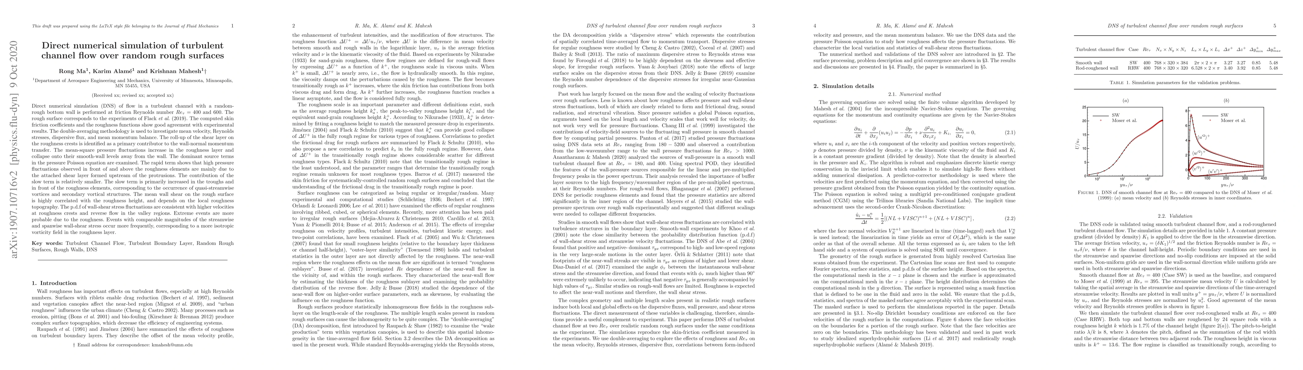 Direct numerical simulation (DNS) of flow in a turbulent channel with a random rough wall is performed at $Re_{\tau}=400$ and $600$. The roughness geometry corresponds to the experiments of Flack and Schultz (personal communication). The rough surface is used on the bottom wall of the channel. DNS of a smooth channel flow and a rod-roughened channel flow are also performed at $Re_{\tau}=400$ for validation and comparison. The skin friction coefficient of the random-rough channel shows good agreement with the experimental results of Flack and Schultz. Due to the roughness, the slip velocity on the rough wall increases while the mean velocity decreases in the log-law region. The streamwise and spanwise velocity fluctuations are enhanced near the rough wall. The pressure fluctuations show a significant increase in the roughness layer and exhibit a good collapse with the smooth wall in the outer layer. The streamwise mean momentum balance shows that pressure and viscous stress gradients are induced in the roughness layer, and the gradients are amplified at higher $Re_{\tau}$. The statistics of wall-shear stress fluctuations in the peak (above the mean height location) and valley (below the mean height location) regions are examined. The results indicate that reverse flow mainly occurs in the valley regions of the random roughness, and is enhanced at higher $Re_{\tau}$, but is not as strong as the recirculation within the cavities in the rod-roughened channel. The probability distribution function of wall-shear stress shows a better collapse after subtracting the mean and normalizing by the root-mean-squared value. The distribution tail is widened by the random roughness, implying that the probability of extreme events is increased. The probability of extreme events in the random-rough channel increases with increasing $Re_{\tau}$, in accordance with previous studies on smooth-wall flows.