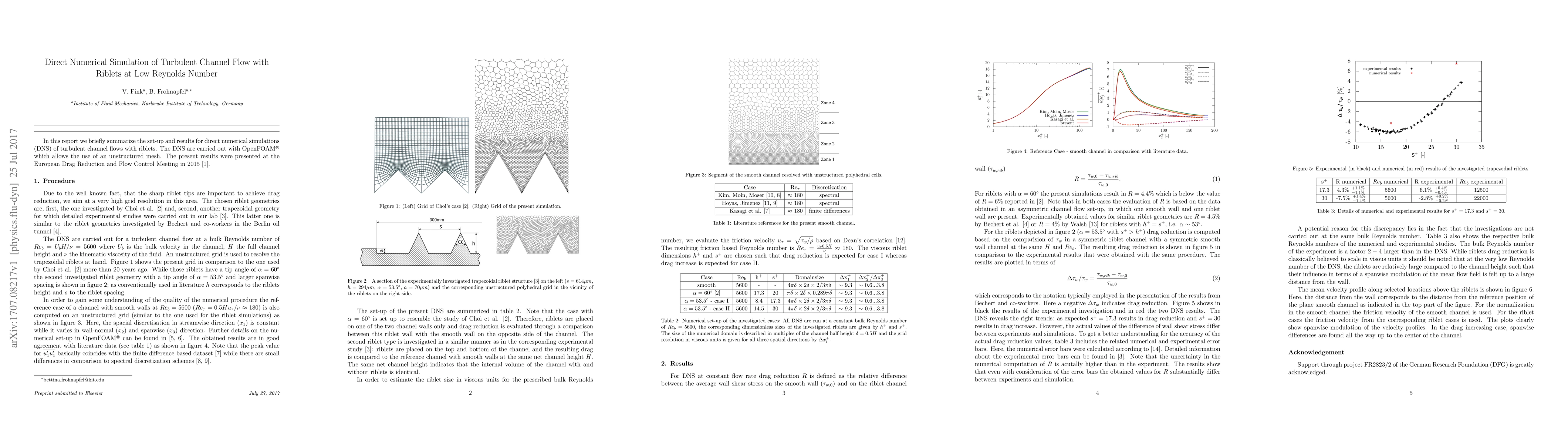 This paper presents direct numerical simulations (DNS) of turbulent channel flows featuring riblets, conducted using OpenFOAM with an unstructured mesh, revealing drag reduction effects at low Reynolds numbers. The findings were showcased at the 2015 European Drag Reduction and Flow Control Meeting.