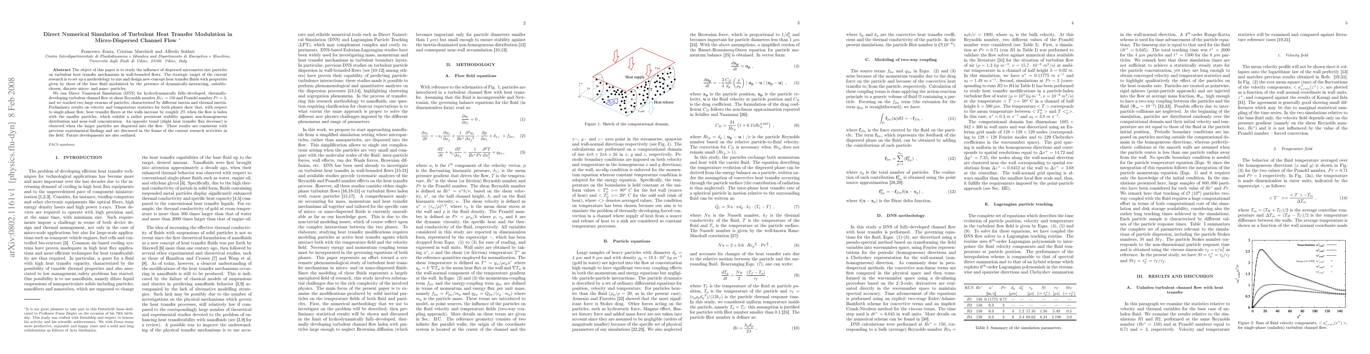 This paper uses Direct Numerical Simulation (DNS) to study how micrometer-sized particles affect turbulent heat transfer in micro-dispersed channel flow, revealing a 2% increase in heat transfer flux with smaller particles and a slight decrease with larger particles. The findings align with experimental results and aim to inform the design of new heat transfer fluids.