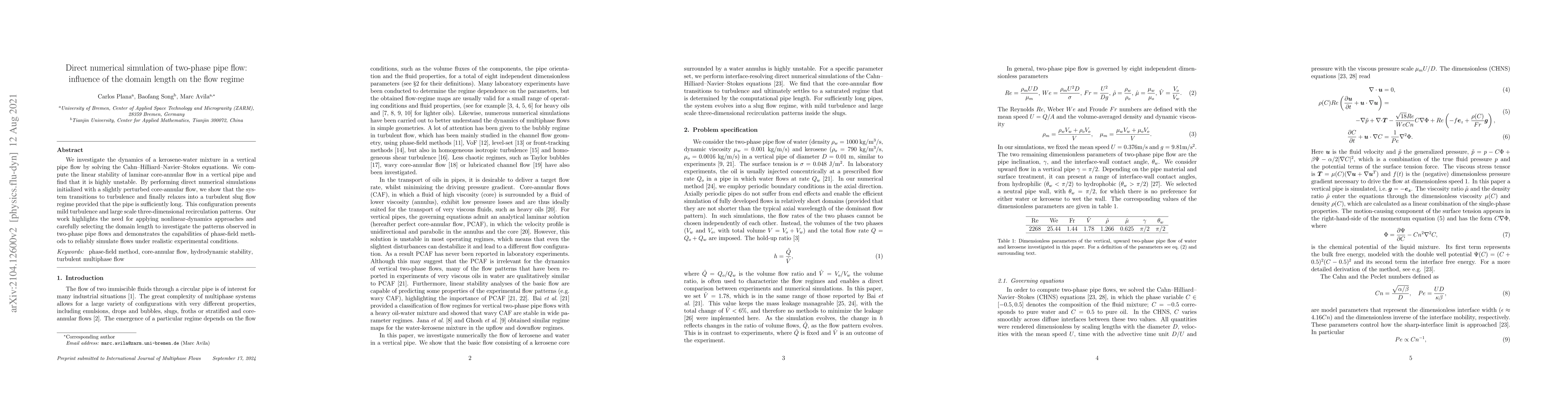 This paper uses direct numerical simulations to study the flow regime of kerosene-water mixtures in vertical pipes, revealing that core-annular flow is unstable and transitions to turbulent slug flow in sufficiently long domains. The research underscores the importance of domain length and nonlinear dynamics in accurately modeling two-phase pipe flows.