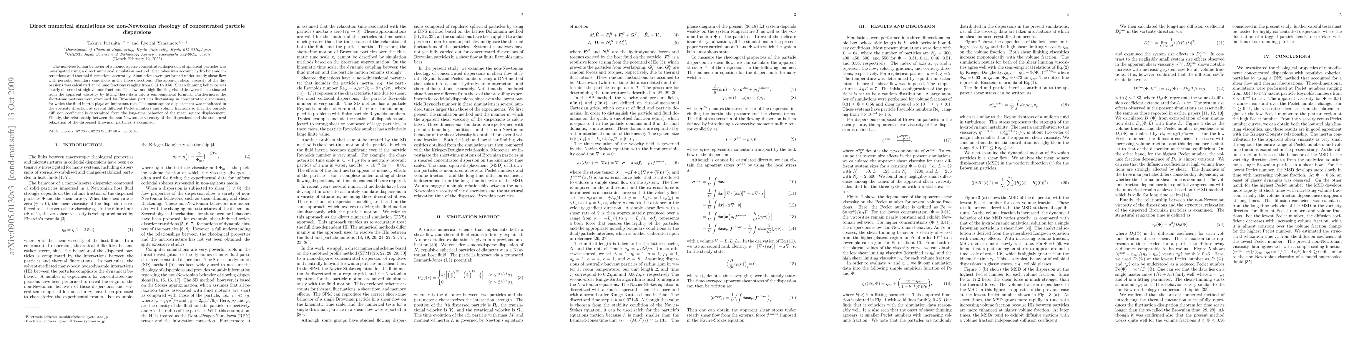 The non-Newtonian behavior of a monodisperse concentrated dispersion of spherical particles was investigated using a direct numerical simulation method, that takes into account hydrodynamic interactions and thermal fluctuations accurately. Simulations were performed under steady shear flow with periodic boundary conditions in the three directions. The apparent shear viscosity of the dispersions was calculated at volume fractions ranging from 0.31 to 0.56. Shear-thinning behavior was clearly observed at high volume fractions. The low- and high-limiting viscosities were then estimated from the apparent viscosity by fitting these data into a semi-empirical formula. Furthermore, the short-time motions were examined for Brownian particles fluctuating in concentrated dispersions, for which the fluid inertia plays an important role. The mean square displacement was monitored in the vorticity direction at several different Peclet numbers and volume fractions so that the particle diffusion coefficient is determined from the long-time behavior of the mean square displacement. Finally, the relationship between the non-Newtonian viscosity of the dispersions and the structural relaxation of the dispersed Brownian particles is examined.