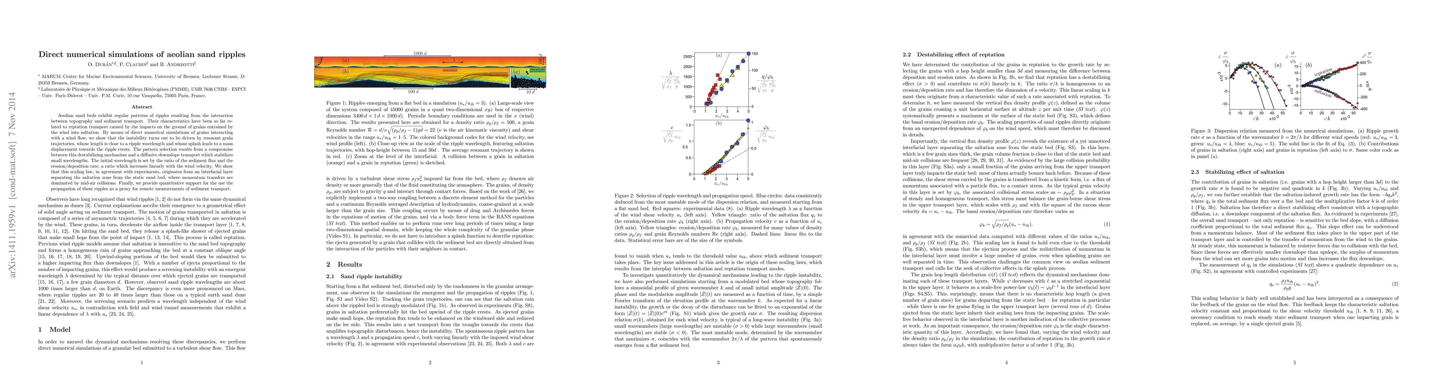 Direct numerical simulations reveal that aeolian sand ripples form due to resonant grain trajectories that destabilize the sediment surface, while diffusive downslope transport stabilizes small wavelengths. The initial ripple wavelength scales linearly with wind velocity, linked to momentum transfers in an interfacial layer dominated by mid-air grain collisions.