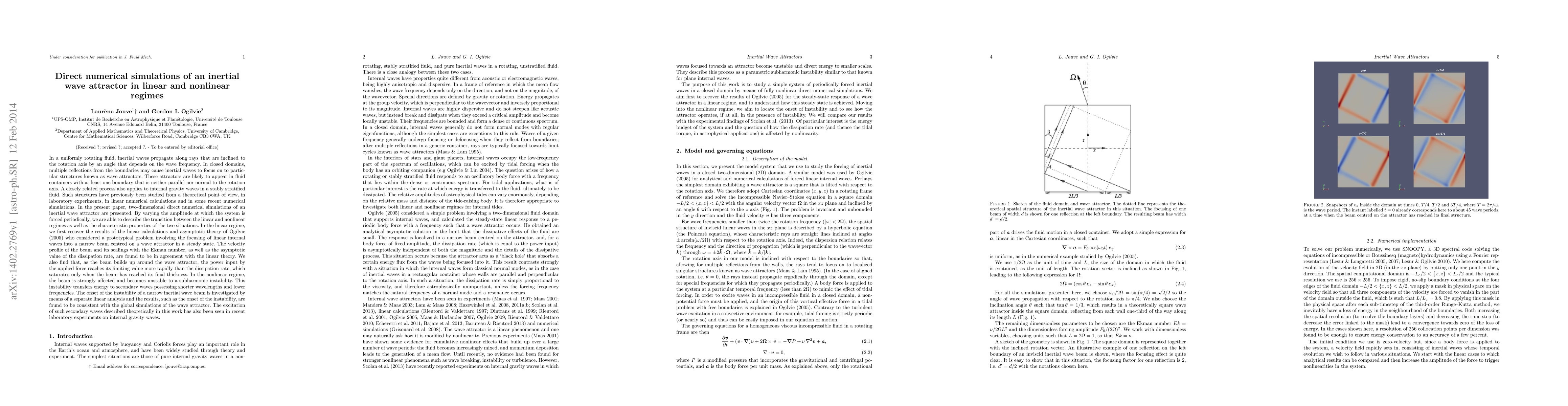 This paper presents two-dimensional direct numerical simulations of inertial wave attractors in both linear and nonlinear regimes, confirming linear theory results and revealing a subharmonic instability in the nonlinear regime that generates secondary waves.