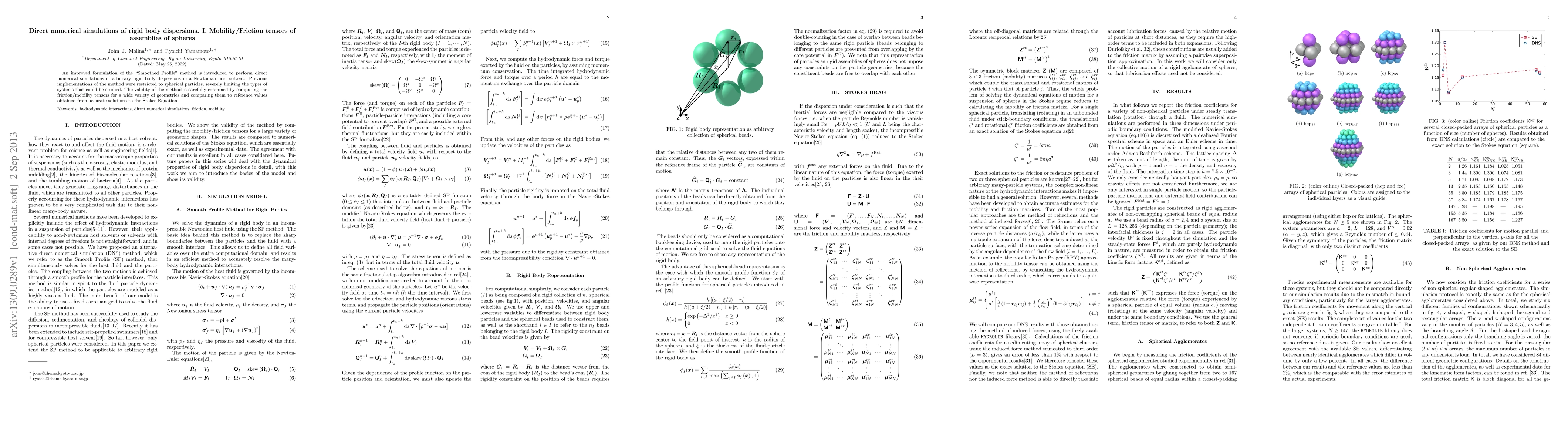 This paper introduces an enhanced Smoothed Profile method for direct numerical simulations of rigid body dispersions, extending its application beyond spherical particles. The method's accuracy is validated by computing friction/mobility tensors for various geometries and comparing results to solutions from the Stokes-Equation.
