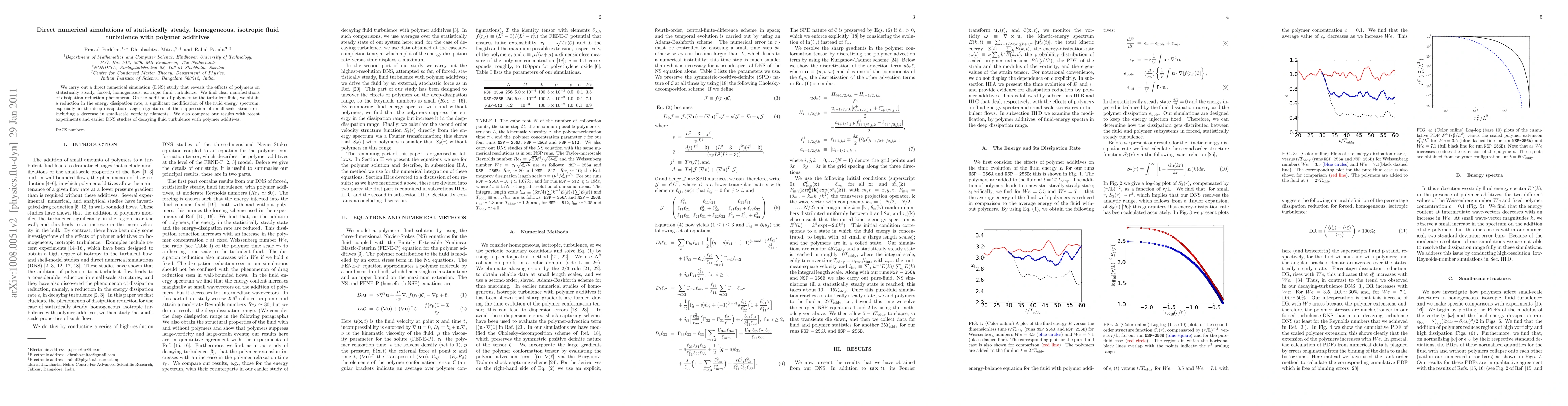 This paper presents a direct numerical simulation (DNS) study on the effects of polymer additives in statistically steady, homogeneous, isotropic fluid turbulence, revealing reduced energy dissipation, modified energy spectrum, suppressed intermittency, and decreased small-scale vorticity filaments. The results are compared to experimental and prior DNS studies.