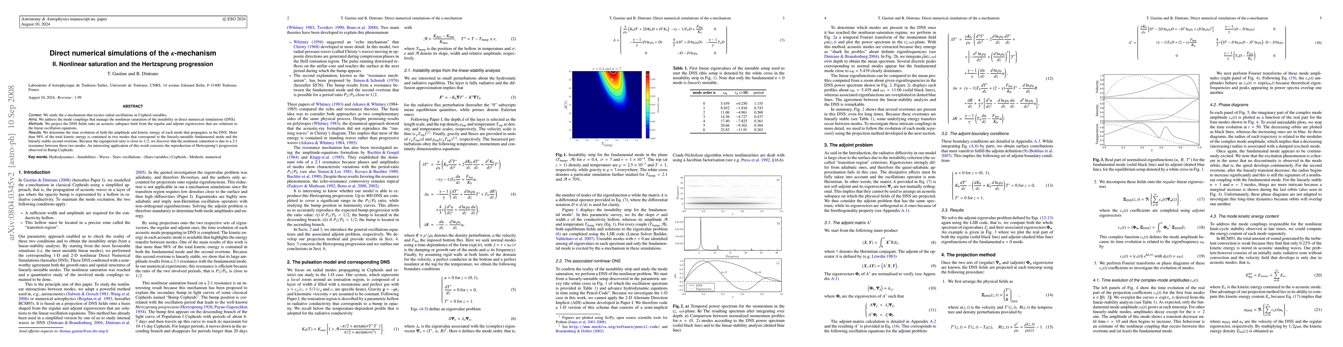 This study uses direct numerical simulations to explore the nonlinear saturation of the kappa-mechanism in Cepheid variables, revealing that over 98% of kinetic energy is concentrated in two modes due to a 2:1 resonance, which explains Hertzsprung's progression in Bump Cepheids.