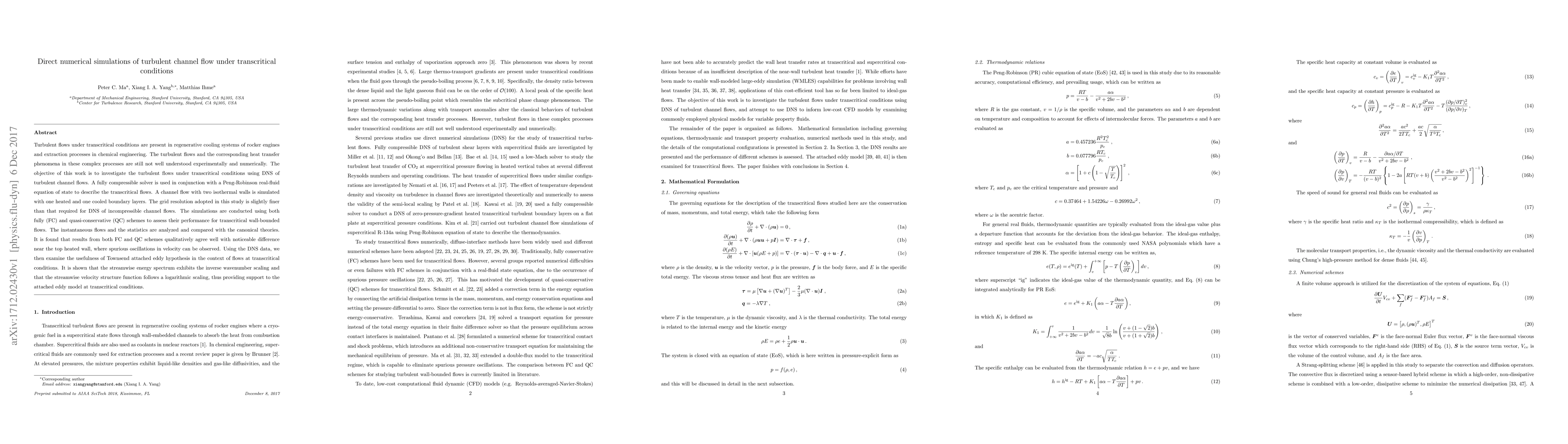 This paper conducts direct numerical simulations (DNS) of turbulent channel flow under transcritical conditions, employing a fully compressible solver and a Peng-Robinson equation of state. The study compares the performance of fully conservative and quasi-conservative schemes, finding good qualitative agreement with experimental theories, though noting spurious oscillations near the heated wall. The research supports the Townsend attached eddy hypothesis for transcritical flows through the analysis of energy spectrum and velocity structure functions.
