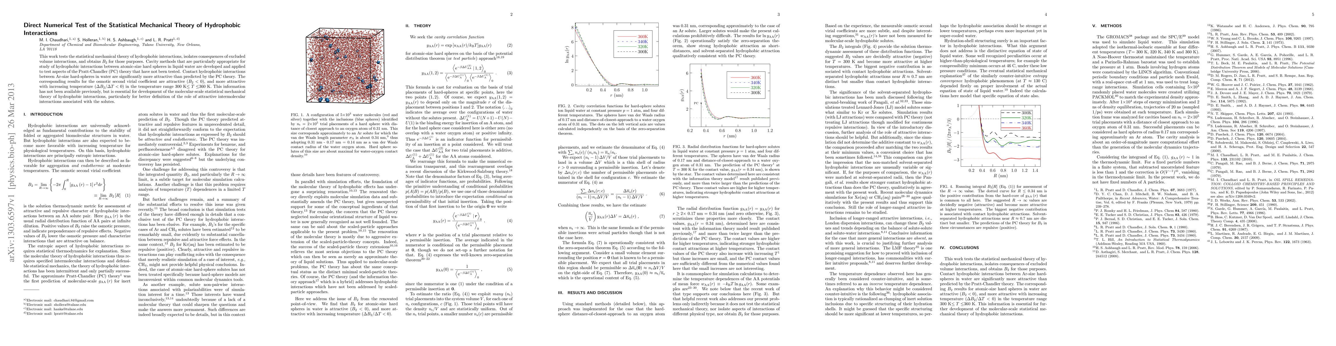 This work tests the statistical mechanical theory of hydrophobic interactions, isolates consequences of excluded volume interactions, and obtains B2 for those purposes. Cavity methods that are particularly appropriate for study of hydrophobic interactions between atomic-size hard spheres in liquid water are developed and applied to test aspects of the Pratt-Chandler (PC) theory that have not been tested. Contact hydrophobic interactions between Ar-size hard-spheres in water are significantly more attractive than predicted by the PC theory. The corresponding results for the osmotic second virial coefficient are attractive (B2 <0), and more attractive with increasing temperature (Delta B2/Delta T < 0) in the temperature range 300K < T < 360K. This information has not been available previously, but is essential for development of the molecular-scale statistical mechanical theory of hydrophobic interactions, particularly for better definition of the role of attractive intermolecular interactions associated with the solutes.