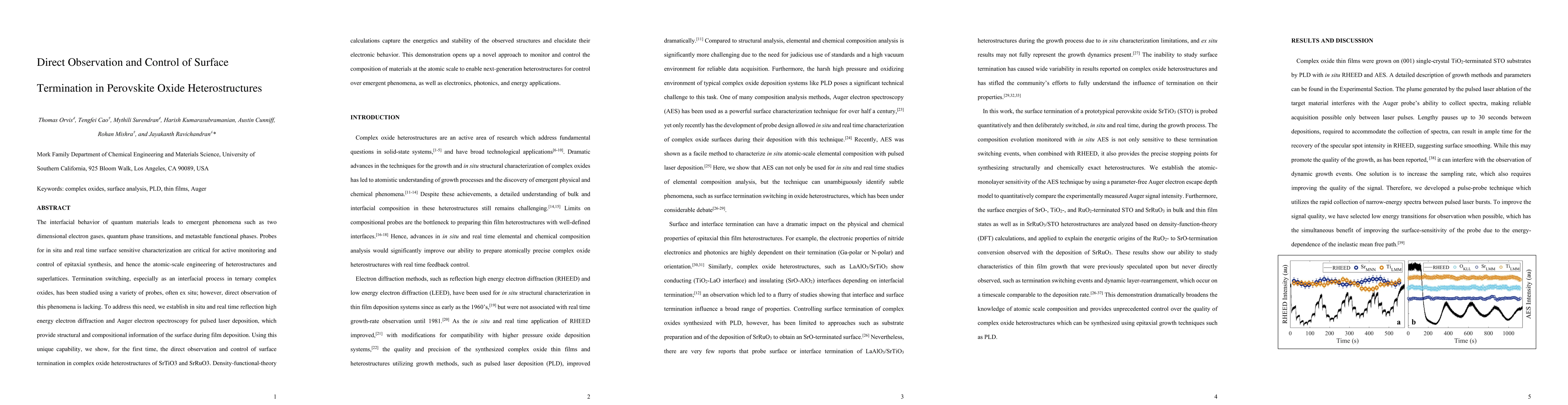 The interfacial behavior of quantum materials leads to emergent phenomena such as two dimensional electron gases, quantum phase transitions, and metastable functional phases. Probes for in situ and real time surface sensitive characterization are critical for active monitoring and control of epitaxial synthesis, and hence the atomic-scale engineering of heterostructures and superlattices. Termination switching, especially as an interfacial process in ternary complex oxides, has been studied using a variety of probes, often ex situ; however, direct observation of this phenomena is lacking. To address this need, we establish in situ and real time reflection high energy electron diffraction and Auger electron spectroscopy for pulsed laser deposition, which provide structural and compositional information of the surface during film deposition. Using this unique capability, we show, for the first time, the direct observation and control of surface termination in complex oxide heterostructures of SrTiO3 and SrRuO3. Density-functional-theory calculations capture the energetics and stability of the observed structures and elucidate their electronic behavior. This demonstration opens up a novel approach to monitor and control the composition of materials at the atomic scale to enable next-generation heterostructures for control over emergent phenomena, as well as electronics, photonics, and energy applications.